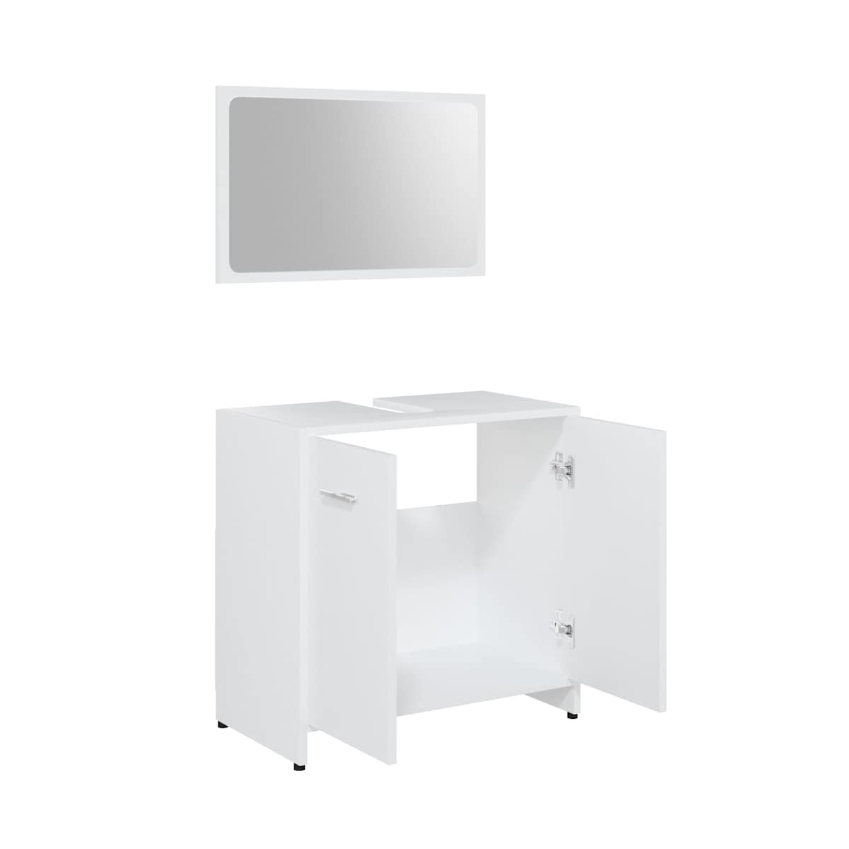 Con este elegante set de muebles de baño, podrás crear espacio de almacenamiento extra para tu baño con un look llamativo y ordenado. Diseño elegante: Las líneas limpias y el diseño elegante se integran perfectamente en el baño. El conjunto de mobiliario, compuesto por espejo y armario, está hecho de madera contrachapada duradero y estable. Este elegante armario cuenta con 1 compartimento y 2 puertas, que ofrece un amplio espacio de almacenamiento para guardar artículos en tu baño. Hay un asa en cada puerta para una mejor apertura y cierre. El espejo también agrega una apariencia excelente a la decoración de tu hogar. Además, este juego de baño es fácil de limpiar con un paño húmedo.