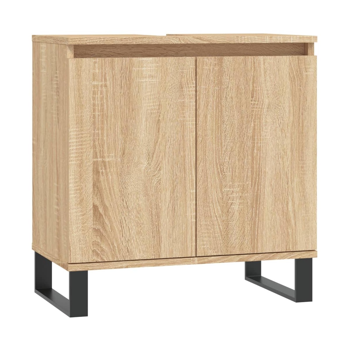 Este set de muebles de baño a la moda está destinado a ser un aporte excelente para el baño, ¡lo que da un aspecto ordenado y llamativo! Material duradero: La madera de ingeniería tiene una calidad excepcional, con una superficie lisa y también cuenta con fuerza, estabilidad y resistencia a la humedad. Patas de hierro: Las patas de hierro añaden un estilo moderno y tranquilo a la casa, además de garantizar su estabilidad.Amplio espacio de almacenaje: El mueble de baño ofrece diversas opciones de almacenaje y un amplio espacio para que puedas guardar objetos en el baño. Diseño práctico: La parte superior del mueble del lavabo es ideal para colocar el lavamanos. Advertencia:Para evitar que vuelque, este producto debe usarse con el dispositivo de fijación a la pared incluido. Información útil:El lavabo no está incluido en la entrega.Los tornillos y los tacos para el interior de la pared no están incluidos. Recomendamos encontrar y utilizar tornillos y tacos adecuados específicamente para las paredes. Si no estás seguro, puedes consultar con un profesional. Lee y sigue cada paso de las instrucciones.