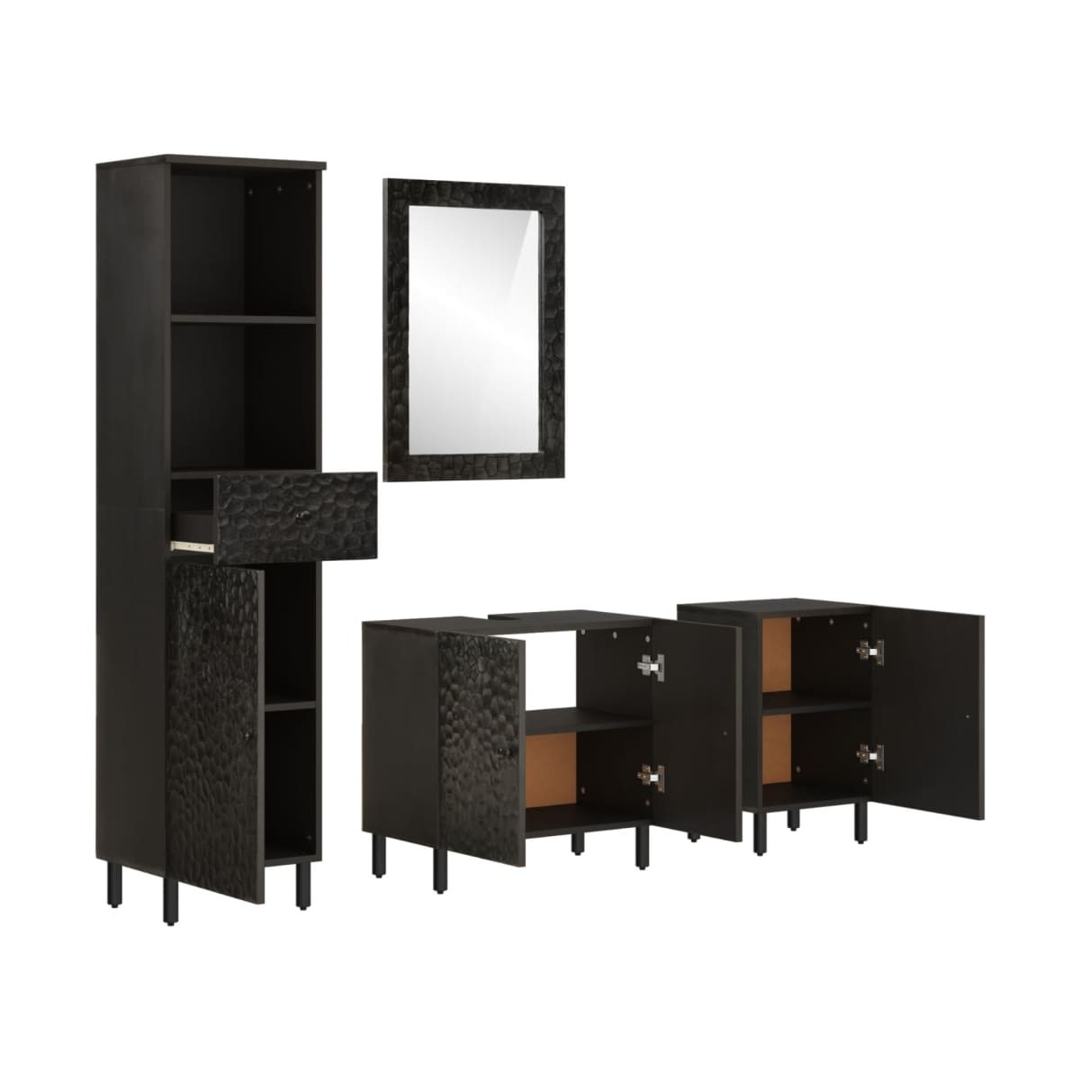 Este atractivo juego de armarios de baño, con amplio espacio de almacenaje, cuenta con un diseño elegante a la par que práctico. Madera maciza de mango: La madera maciza de mango es una madera dura, tropical y resistente, que sirve para hacer muebles robustos. Las bonitas vetas de la madera hacen que cada mueble sea ligeramente diferente al resto.Amplio espacio de almacenamiento: Este mueble de baño ofrece un amplio espacio de almacenamiento para mantener tus elementos esenciales bien organizados y al alcance.Patas resistentes: Las patas de hierro añaden robustez y estabilidad al mueble de baño. Información útil:Los tornillos y los tacos para el interior de la pared no están incluidos. Recomendamos encontrar y utilizar tornillos y tacos adecuados específicamente para las paredes. Si no estás seguro, puedes consultar con un profesional. Lee y sigue cada paso de las instrucciones. Advertencia:Para evitar que vuelque, este producto debe usarse con el dispositivo de fijación a la pared suministrado.
