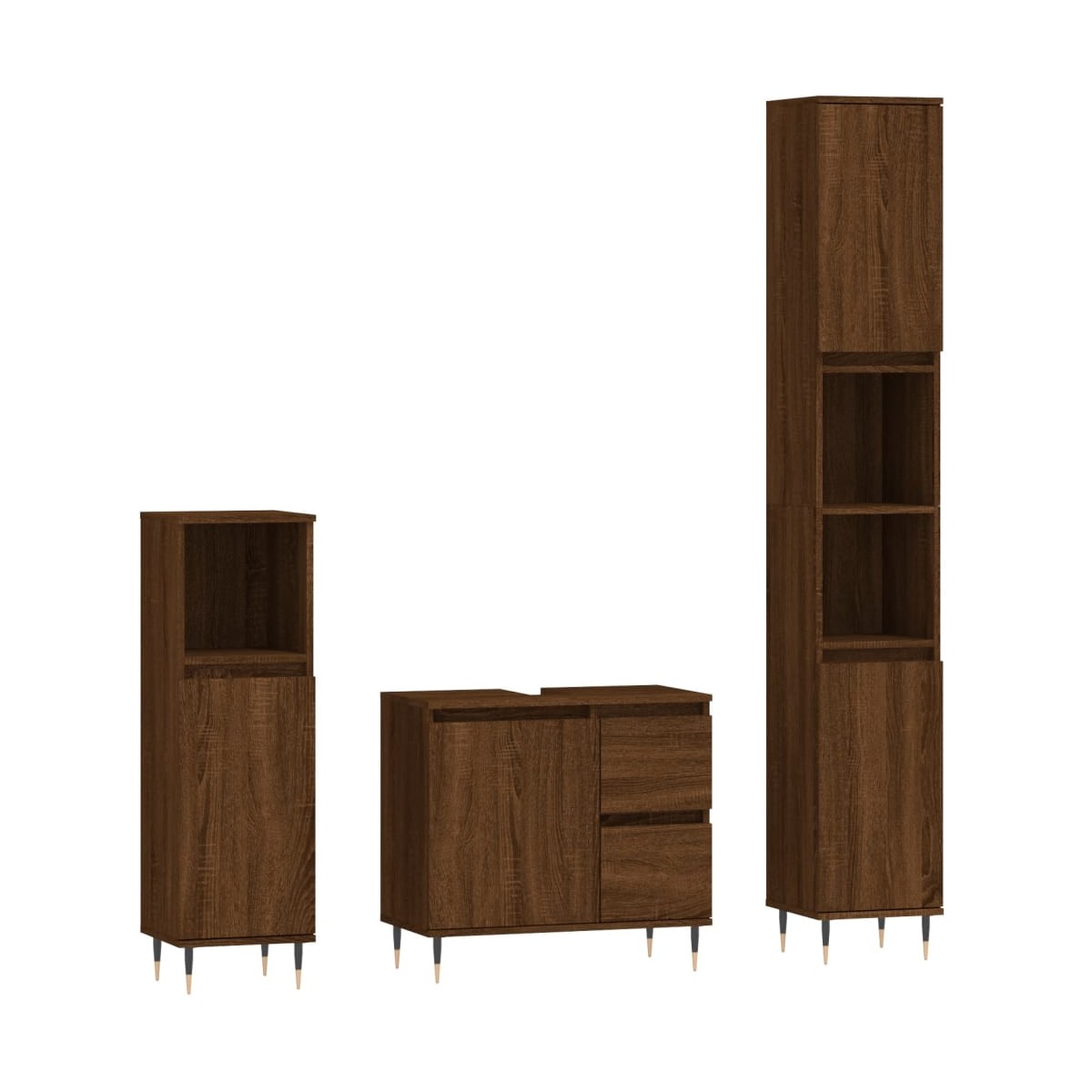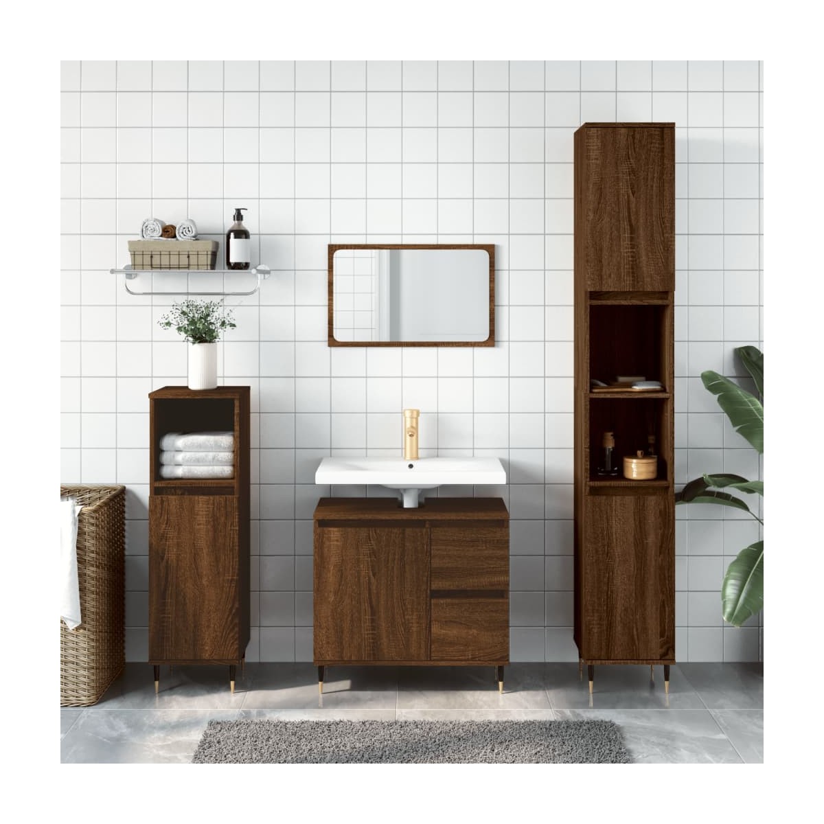 Este set de muebles de baño a la moda está destinado a ser un aporte excelente para el baño, ¡lo que da un aspecto ordenado y llamativo! Material duradero: La madera de ingeniería tiene una calidad excepcional, con una superficie lisa y también cuenta con fuerza, estabilidad y resistencia a la humedad. Patas de hierro: Las patas de hierro añaden un estilo moderno y tranquilo a la casa, además de garantizar su estabilidad.Amplio espacio de almacenaje: El mueble de baño ofrece diversas opciones de almacenaje y un amplio espacio para que puedas guardar objetos en el baño. Diseño práctico: La parte superior del mueble del lavabo es ideal para colocar el lavamanos. Advertencia:Para evitar que vuelque, este producto debe usarse con el dispositivo de fijación a la pared incluido. Información útil:El lavabo no está incluido en la entrega.Los tornillos y los tacos para el interior de la pared no están incluidos. Recomendamos encontrar y utilizar tornillos y tacos adecuados específicamente para las paredes. Si no estás seguro, puedes consultar con un profesional. Lee y sigue cada paso de las instrucciones.