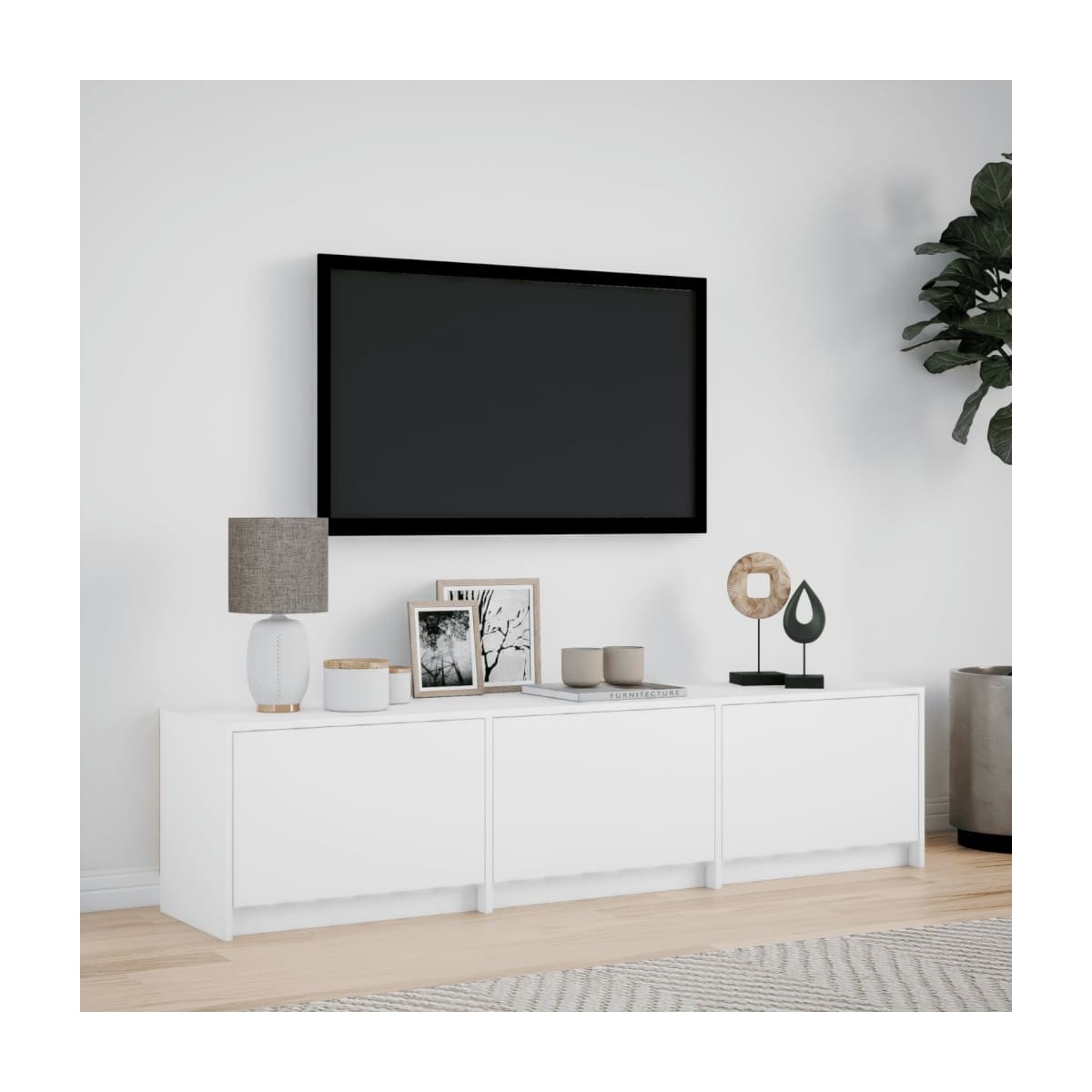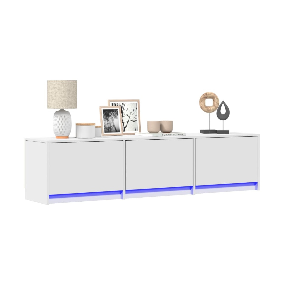 Con un diseño moderno y práctico, este mueble para la TV con luces LED definitivamente se conviertirá en el centro de atención de tu habitación. Material duradero:La madera de ingeniería tiene una calidad excepcional, con una superficie lisa y también con fuerza, estabilidad y resistencia a la humedad.Luces LED RGB para un ambiente agradable: Este soporte de TV cuenta con luces LED que se pueden ajustar fácilmente para crear un espectáculo de luces personalizado. Puedes personalizar los modos, los colores y el brillo para mejorar el ambiente de tu hogar.Amplio espacio de almacenamiento: Este mueble de TV proporciona un amplio espacio de almacenamiento para mantener tus revistas, libros, DVD y dispositivos multimedia bien organizados y al alcance de la mano.Superficie estable y resistente: La robusta superficie es ideal para colocar el televisor y el equipo de música o algunos objetos decorativos como jarrones o macetas. Información útil:El producto tiene un conector USB que necesita una fuente de alimentación USB certificada de 5 V (no incluida). Advertencia:Para evitar que vuelque, este producto debe usarse con el dispositivo de fijación a la pared suministrado.