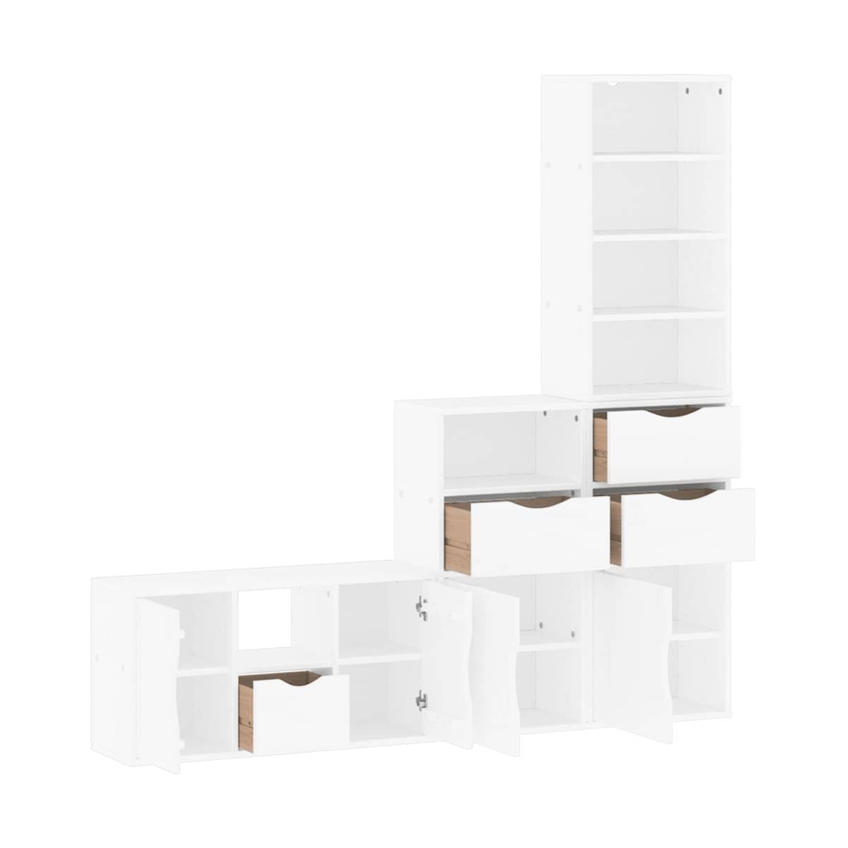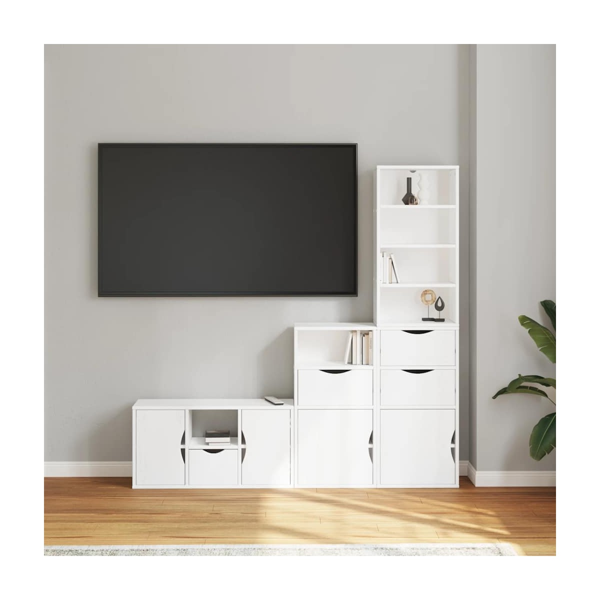 ¡Optimice el espacio de su sala de estar sin sacrificar el estilo con este conjunto completo de unidades de TV de madera con almacenamiento! Material robusto y estable: La madera maciza de pino es conocida por su resistencia y durabilidad. Sus vetas rectas y sus característicos nudos contribuyen a su encanto rústico.Amplio espacio de almacenamiento: Este mueble de TV proporciona un amplio espacio de almacenamiento para mantener tus revistas, libros, DVD y dispositivos multimedia bien organizados y al alcance de la mano.Superficie estable y resistente: La robusta superficie es ideal para colocar el televisor y el equipo de música o algunos objetos decorativos como jarrones o macetas.Diseño modular: estos gabinetes ofrecen apilamiento modular y opciones de disposición versátiles, que incluyen torres verticales, diseños en forma de L y filas horizontales, lo que le permite personalizarlos para adaptarlos a sus necesidades.Fácil de mantener: El soporte del televisor es fácil de limpiar con un paño húmedo y requiere menos mantenimiento. Advertencia:Para evitar que vuelque, este producto debe usarse con el dispositivo de fijación a la pared suministrado.Información útil:Este mueble de almacenamiento complementa perfectamente otras piezas de la serie ODDA, lo que le permite combinar el estilo perfectamente o combinarlos para soluciones de almacenamiento más grandes.