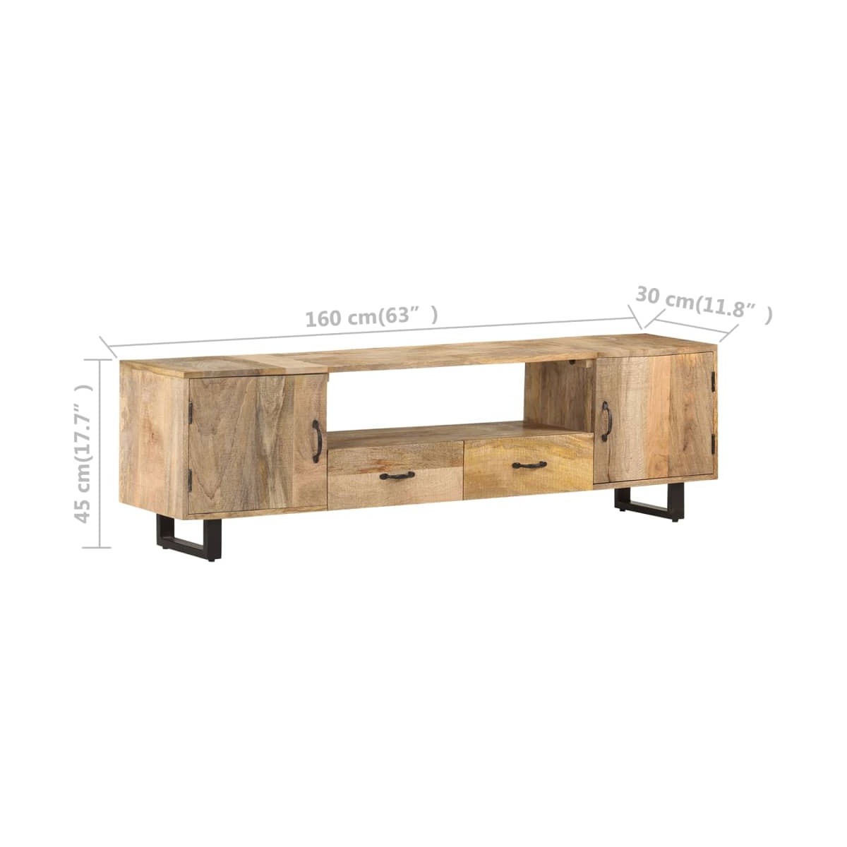 Este moderno mueble de TV de madera, con un gran espacio de almacenaje, está destinado a ser el centro de atención de tu salón, recibidor o cuarto de ocio. Este armario bajo está hecho de madera maciza de mango, una madera dura tropical con la fuerza para soportar pesos y aguantar el desgaste y el paso del tiempo. La exquisita artesanía y las bonitas vetas de la madera hacen que cada pieza sea ligeramente diferente al resto. El armario para televisión posee 2 puertas, 2 cajones y un compartimento abierto con gran espacio de almacenaje para guardar organizados y al alcance DVD, dispositivos multimedia, libros y otros objetos pequeños. Además, las fuertes patas con recubrimiento en polvo refuerzan su solidez. Nota importante: Los colores varían de una pieza a otra, por lo que cada una es única; la entrega es aleatoria.