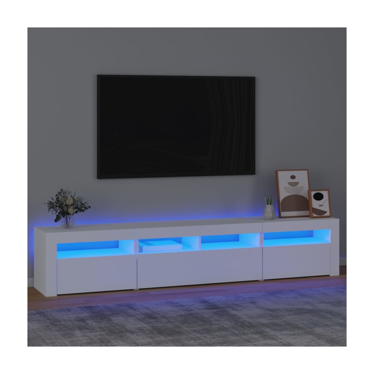 Con un diseño moderno y práctico, este mueble para la TV con luces LED definitivamente se convierte en el centro de atención de tu habitación. Material práctico: La madera contrachapada tiene una calidad excepcional, con una superficie lisa y también cuenta con fuerza, estabilidad y resistencia a la humedad. Luces LED de colores: El soporte de TV cuenta con luces LED RGB, que tiene diferentes menús para cambiar el color de las luces y dejar que el color se ajuste automáticamente de forma diferente. Las luces LED subrayan el aspecto moderno y contribuyen a la sensación de moda.Amplio espacio de almacenamiento: El mueble de TV ofrece mucho espacio de almacenamiento para mantener tus revistas, libros, mandos a distancia y otros objetos pequeños bien organizados y al alcance de la mano.Función de exhibición: La robusta parte superior del armario multimedia es ideal para exponer objetos decorativos, marcos de fotos o plantas en maceta. Nota:El producto tiene un conector USB, pero no se incluye la fuente de alimentación USB de 5 V certificada.Cada producto viene con un manual de montaje en la caja para facilitar el montaje.