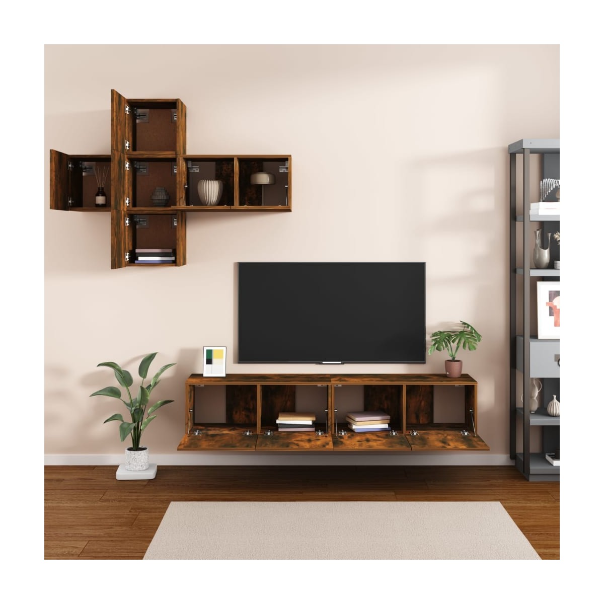 Este set de muebles de TV clásico está diseñado para ser el centro de atención de tu estancia, gracias a su diseño moderno a la par que práctico. Material robusto: La madera contrachapada tiene una calidad excepcional, con una superficie lisa y también cuenta con fuerza, estabilidad y resistencia a la humedad.Amplio espacio de almacenamiento: El conjunto de muebles de TV ofrece un amplio espacio de almacenamiento para mantener todas tus revistas, DVD y cualquier otro artículo bien organizados.Montaje en la pared: Estos muebles para TV no ocupan espacio en el suelo. Puedes colgarlo en la pared fácilmente. Nota:Los tornillos y los tacos para el interior de la pared no están incluidos. Busca y utiliza tornillos y tacos adecuados para tus paredes. Si no lo tienes claro, busca asesoramiento profesional. Lee y sigue cada paso de las instrucciones cuidadosamente.Cada producto viene con un manual de montaje en la caja para facilitar el montaje.