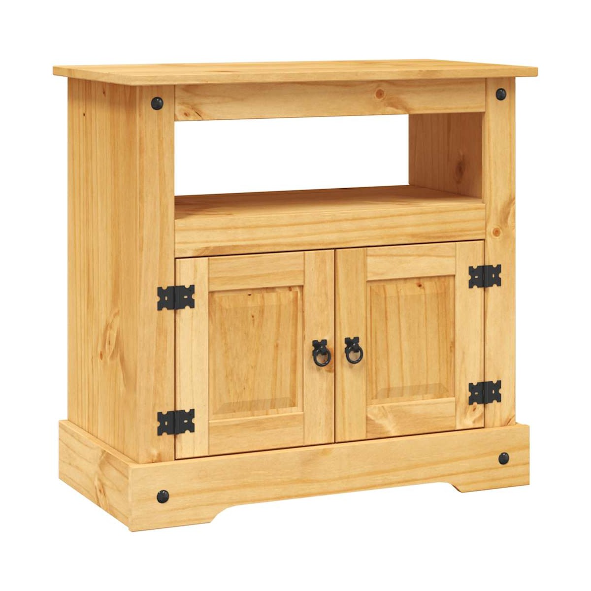 Este mueble de TV de madera de alta calidad es un mueble con el estilo mexicano Corona. El mueble de TV desprende un encanto rústico mexicano que lo convertirá en un gran aporte para tu salón. El mueble tiene una parte superior robusta en la que puedes colocar el televisor, las lámparas o elementos decorativos como marcos de fotos o jarrones. Cuenta con un mueble y un estante, lo que proporciona un amplio espacio para guardar y organizar libros, revistas y otras cosas útiles, o para guardar el reproductor de DVD, la videoconsola o el dispositivo de streaming. El montaje es fácil.