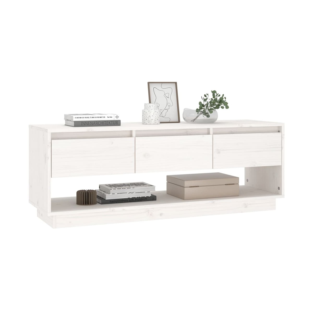 Este mueble de TV de madera con cajones, de líneas limpias y aspecto sencillo, aporta un toque de elegancia a tu habitación. Material de primera calidad: La madera maciza de pino es un bonito material natural. Trata la superficie con aceite, cera, laca o un acabado de barniz para conseguir una superficie más fuerte y más fácil de limpiar. La madera de pino tiene vetas rectas, y los nudos dan al material su distintivo aspecto rústico.Estructura robusta y estable: La estructura de madera garantiza su solidez y estabilidad.Amplio espacio de almacenamiento: El mueble de TV tiene tres cajones deslizantes suaves y un compartimento grande. El espacio de almacenaje permite tener las cosas organizadas.Función de visualización: La robusta superficie es ideal para exhibir objetos decorativos, marcos de fotos o plantas en macetas.