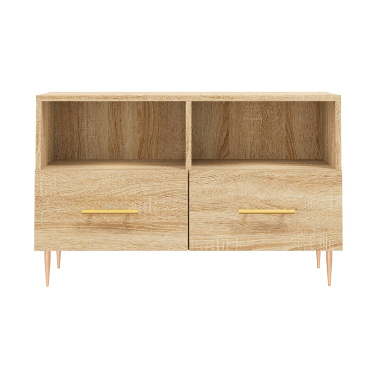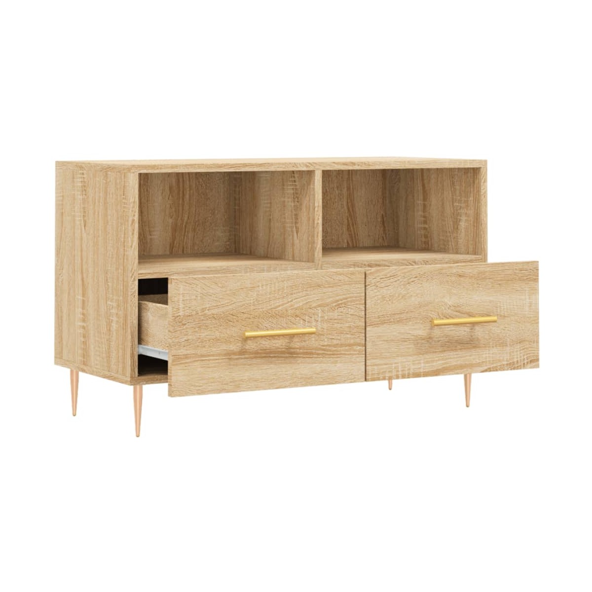 Este robusto mueble para TV está diseñado para ser el centro de atención de tu estancia, gracias a su diseño moderno a la par que práctico. Material robusto: La madera contrachapada tiene una calidad excepcional, con una superficie lisa y también cuenta con fuerza, estabilidad y resistencia a la humedad. Hecha de madera contrachapada, el mueble de TV es fácil de limpiar.Amplio almacenaje: El mueble de TV tiene 2 compartimentos y 2 cajones que lo convierten en un lugar ideal para guardar todas las revistas, DVD y otros objetos.Función expositora: La resistente superficie del mueble es ideal para exhibir objetos decorativos como marcos de fotos y plantas.Patas de hierro: Las patas de hierro dan un estilo tranquilo a la casa, además de garantizar la estabilidad de la mesa. Advertencia:Para evitar el vuelco, este producto debe usarse con el dispositivo provisto para fijarlo a la pared.