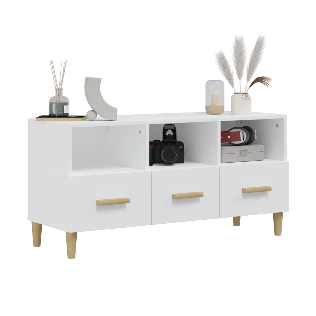Este moderno mueble de TV será el centro de atención de la sala de estar e incluso de la zona de entretenimiento. Material robusto: La madera contrachapada tiene una calidad excepcional, con una superficie lisa y también cuenta con fuerza, estabilidad y resistencia a la humedad.Amplio espacio de almacenamiento: Este moderno mueble mantendrá los dispositivos y soportes multimedia perfectamente organizados gracias a los cajones y compartimentos incluidos.Superficie robusta: La superficie del armario auxiliar es el lugar ideal para colocar artículos como libros y adornos. Advertencia:Para evitar el vuelco, este producto debe usarse con el dispositivo provisto para fijarlo a la pared.Nota:Cada producto viene con un manual de montaje en la caja para facilitar el montaje.
