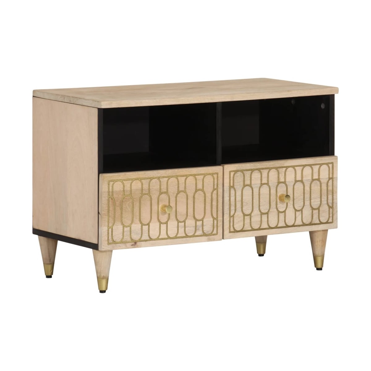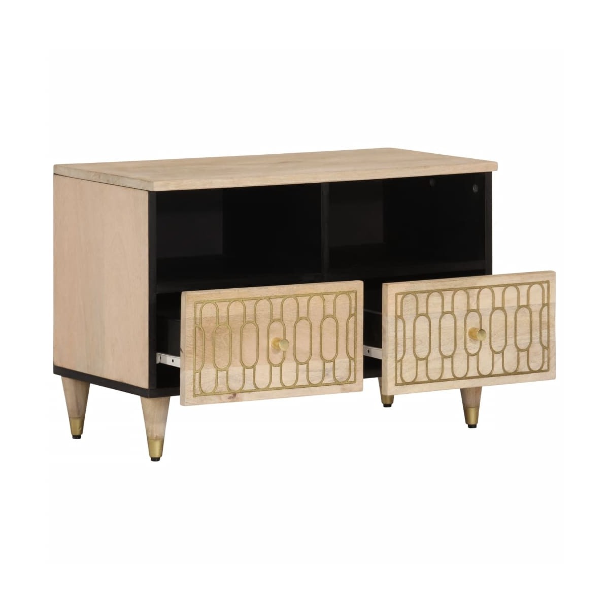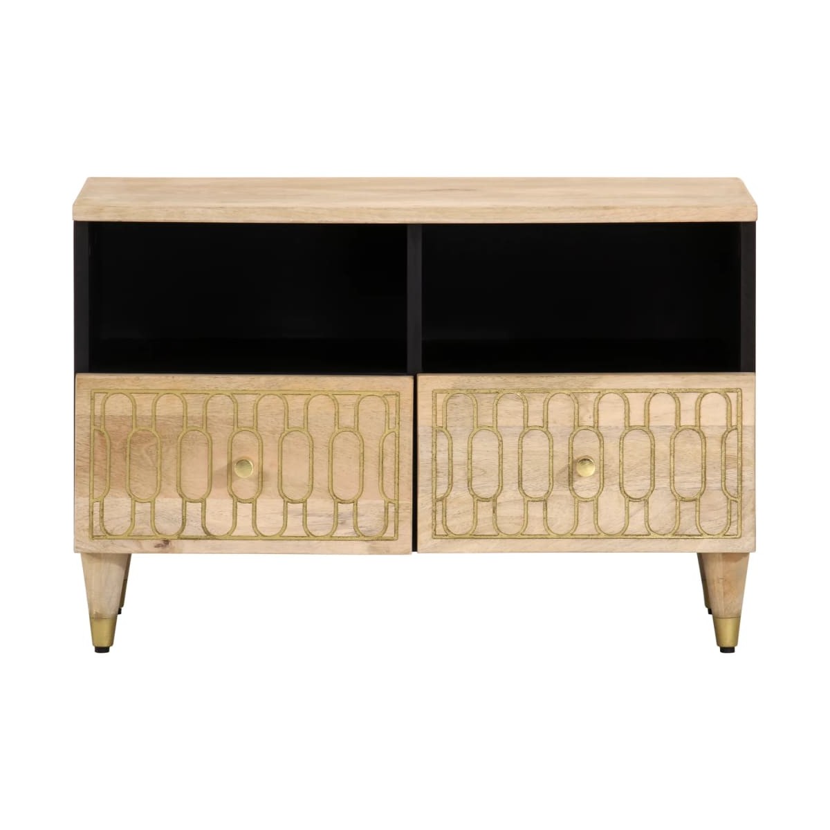 Este robusto mueble para TV está diseñado para ser el centro de atención de tu estancia, gracias a su diseño moderno a la par que práctico. Madera maciza de mango: La madera maciza de mango es una madera dura, tropical y resistente, que sirve para hacer muebles robustos. Las bonitas vetas de la madera hacen que cada mueble sea ligeramente diferente al resto. Hecho de madera maciza de mango, el mueble para el televisor es duradero y estable.Almacenamiento espacioso: El mueble de TV tiene un amplio espacio de almacenaje que lo convierte en un lugar ideal para guardar todas tus revistas, DVDs y otros artículos.Función expositora: La resistente superficie del mueble es ideal para exhibir objetos decorativos como marcos y plantas.Patas de madera: Las patas de madera dan al producto un look natural y agradable al mismo tiempo que garantizan la estabilidad. Combina bien con cualquier decoración de interior.Diseño tallado a mano: Este mueble de salón con patrones tallados a mano aporta el lujo de un encanto elegante a tu hogar, siendo el centro de atención de la estancia. Información útil:Cada artículo es único, con variaciones de color y veta. La entrega es aleatoria garantizando la exclusividad y la individualidad del producto.