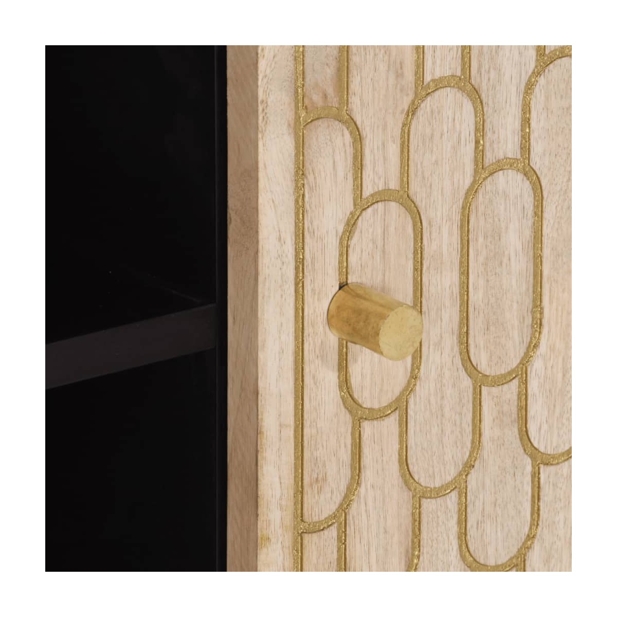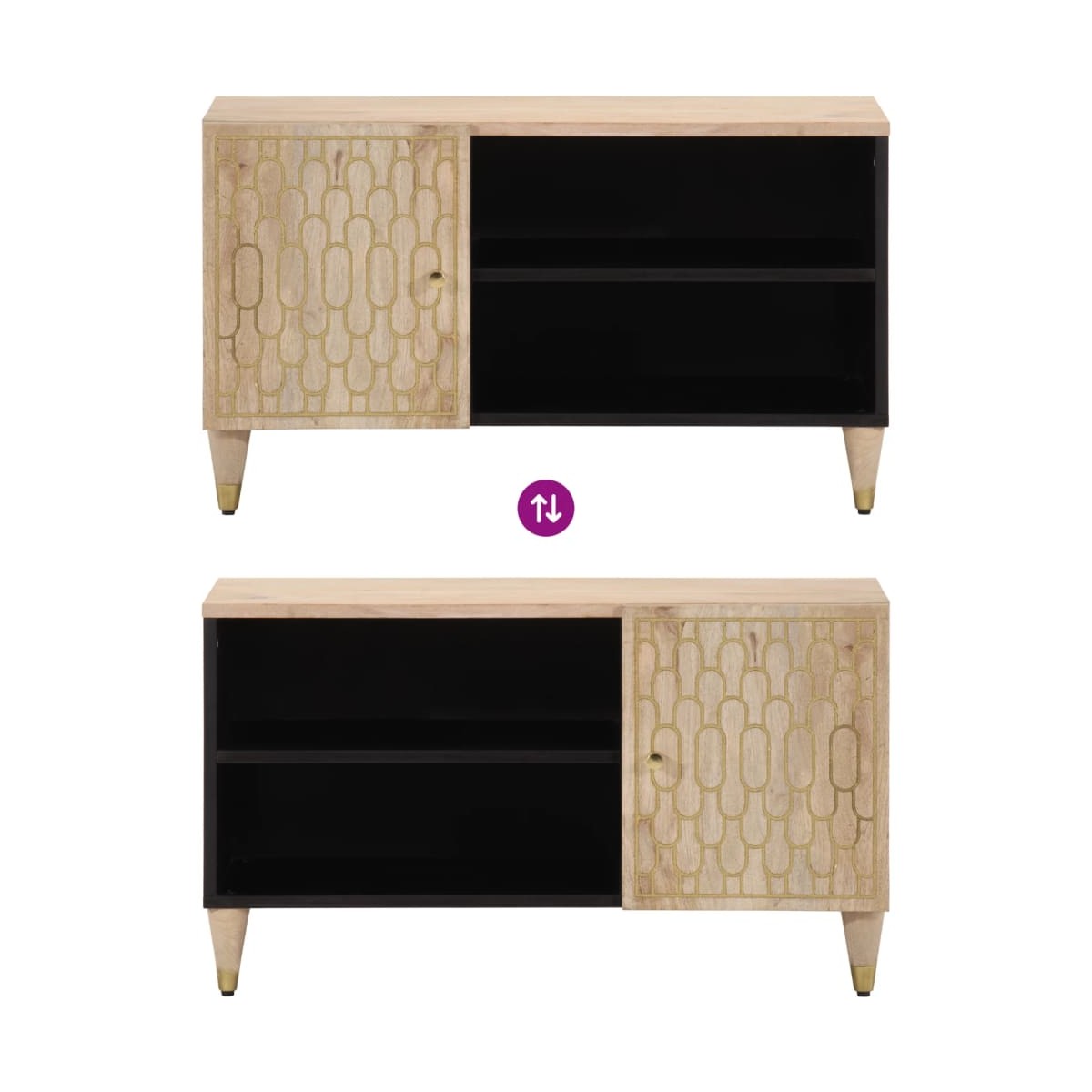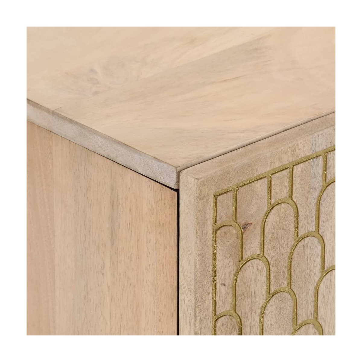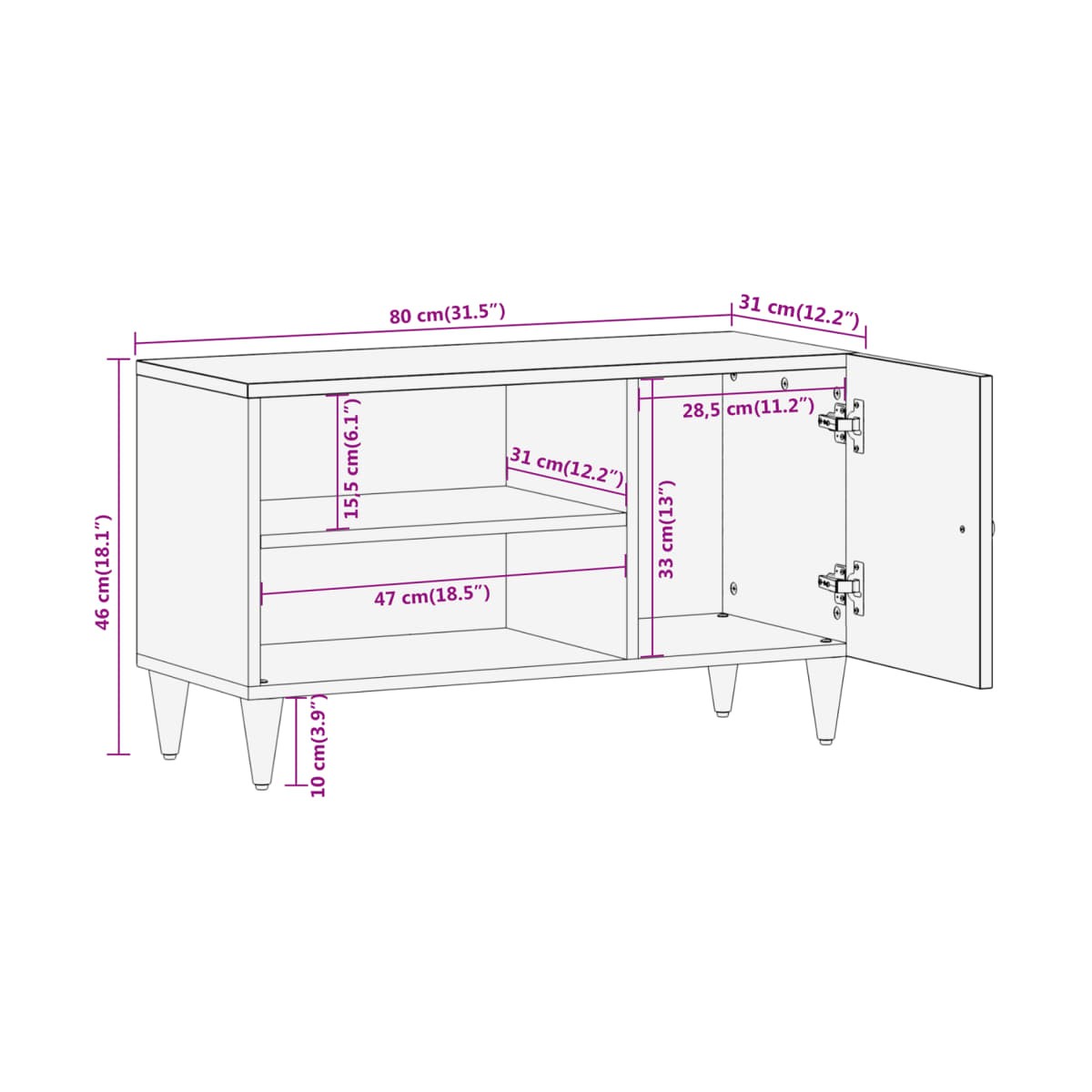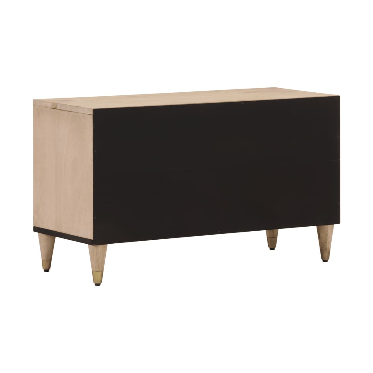 Este robusto mueble para TV está diseñado para ser el centro de atención de tu estancia, gracias a su diseño moderno a la par que práctico. Madera maciza de mango: La madera maciza de mango es una madera dura, tropical y resistente, que sirve para hacer muebles robustos. Las bonitas vetas de la madera hacen que cada mueble sea ligeramente diferente al resto. Hecho de madera maciza de mango, el mueble para el televisor es duradero y estable.Almacenamiento espacioso: El mueble de TV tiene un amplio espacio de almacenaje que lo convierte en un lugar ideal para guardar todas tus revistas, DVDs y otros artículos.Función expositora: La resistente superficie del mueble es ideal para exhibir objetos decorativos como marcos y plantas.Patas de madera: Las patas de madera dan al producto un look natural y agradable al mismo tiempo que garantizan la estabilidad. Combina bien con cualquier decoración de interior.Diseño tallado a mano: Este mueble de salón con patrones tallados a mano aporta el lujo de un encanto elegante a tu hogar, siendo el centro de atención de la estancia. Información útil:Cada artículo es único, con variaciones de color y veta. La entrega es aleatoria garantizando la exclusividad y la individualidad del producto.