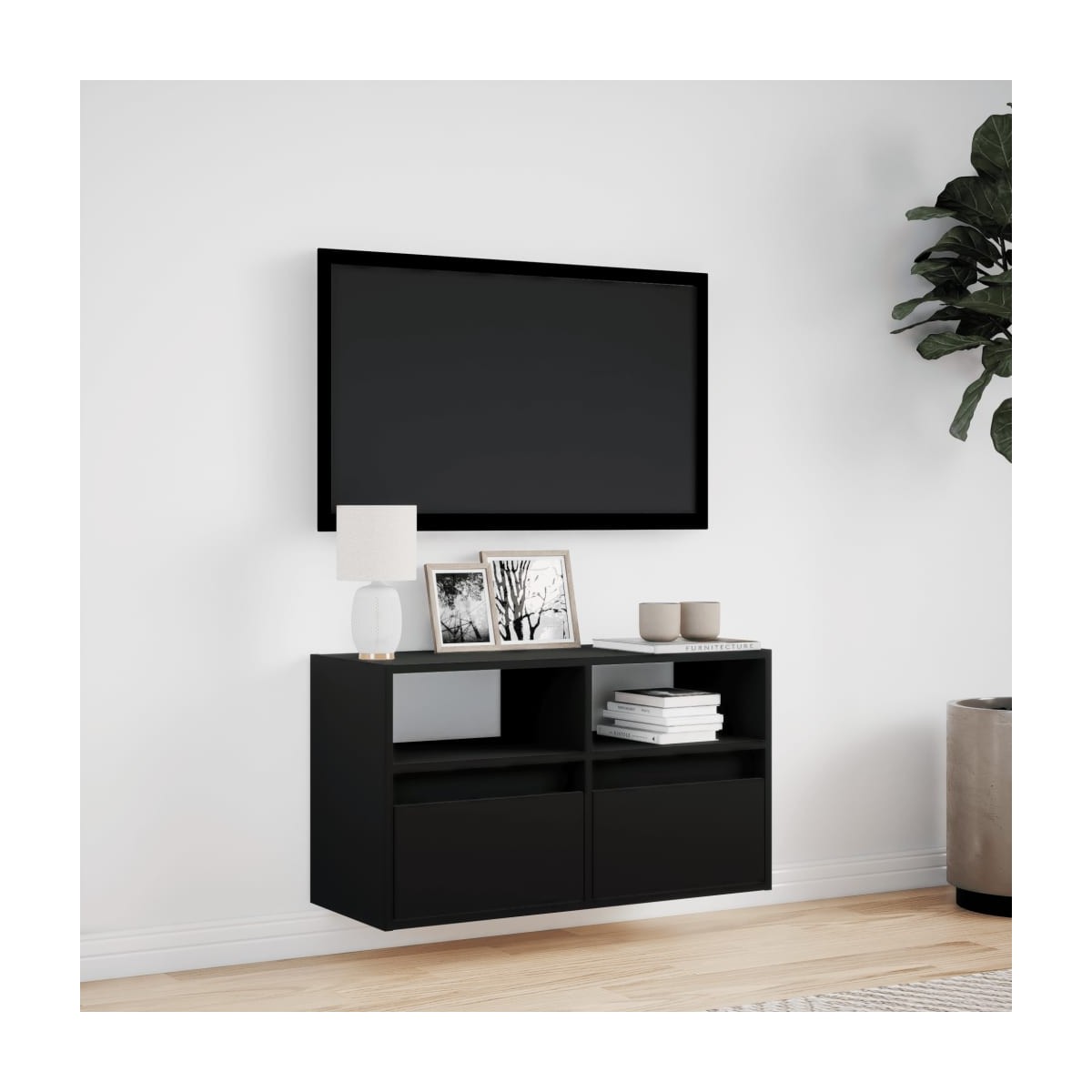Este mueble de TV de pared es la solución perfecta para la casa, con el fin de maximizar el espacio y mantener el suelo despejado.Material estable y duradero: La madera de ingeniería es un material duradero y estable con una superficie lisa que es resistente a la humedad, la deformación y la rotura, lo que la convierte en una opción fiable para una variedad de proyectos.Luces LED RGB para un ambiente agradable: Este armario de TV cuenta con luces LED que se pueden ajustar fácilmente para crear un espectáculo de luces personalizado. Puedes personalizar los modos, los colores y el brillo para mejorar el ambiente de tu hogar.Amplio espacio de almacenamiento: Este soporte de TV tiene 2 cajones y 2 compartimentos, lo que proporciona un amplio espacio para guardar sus elementos esenciales diarios, como libros, DVD, revistas, suministros multimedia y otros artículos, perfectamente organizados y al alcance de la mano.Ahorro de espacio: El diseño de pared aprovecha al máximo el espacio no utilizado de la pared, convirtiéndolo en una zona de almacenamiento compacta y eficiente.Diseño DIY: El mueble de TV flotante ofrece infinitas opciones de diseño, lo que te permite utilizarlo solo o combinarlo con otros muebles altos de TV para crear un centro de entretenimiento completo.Información útil:Los tornillos y los tacos para el interior de la pared no están incluidos. Te recomendamos buscar y utilizar tornillos y tacos adecuados específicamente para tus paredes. Si no estás seguro, puedes consultar con un profesional. Lee y sigue cada paso de las instrucciones.El producto tiene un conector USB que necesita una fuente de alimentación USB certificada de 5 V (no incluida).