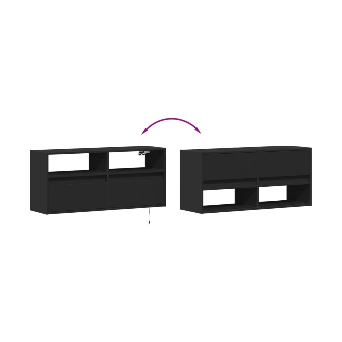 Este mueble de TV de pared es la solución perfecta para la casa, con el fin de maximizar el espacio y mantener el suelo despejado.Material estable y duradero: La madera de ingeniería es un material duradero y estable con una superficie lisa que es resistente a la humedad, la deformación y la rotura, lo que la convierte en una opción fiable para una variedad de proyectos.Luces LED RGB para un ambiente agradable: Este armario de TV cuenta con luces LED que se pueden ajustar fácilmente para crear un espectáculo de luces personalizado. Puedes personalizar los modos, los colores y el brillo para mejorar el ambiente de tu hogar.Amplio espacio de almacenamiento: Este soporte de TV tiene 2 cajones y 2 compartimentos, lo que proporciona un amplio espacio para guardar sus elementos esenciales diarios, como libros, DVD, revistas, suministros multimedia y otros artículos, perfectamente organizados y al alcance de la mano.Ahorro de espacio: El diseño de pared aprovecha al máximo el espacio no utilizado de la pared, convirtiéndolo en una zona de almacenamiento compacta y eficiente.Diseño DIY: El mueble de TV flotante ofrece infinitas opciones de diseño, lo que te permite utilizarlo solo o combinarlo con otros muebles altos de TV para crear un centro de entretenimiento completo.Información útil:Los tornillos y los tacos para el interior de la pared no están incluidos. Te recomendamos buscar y utilizar tornillos y tacos adecuados específicamente para tus paredes. Si no estás seguro, puedes consultar con un profesional. Lee y sigue cada paso de las instrucciones.El producto tiene un conector USB que necesita una fuente de alimentación USB certificada de 5 V (no incluida).
