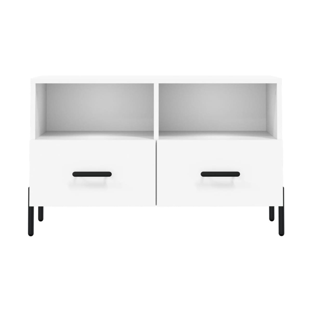 Este robusto mueble para TV está diseñado para ser el centro de atención de tu estancia, gracias a su diseño moderno a la par que práctico. Material robusto: La madera contrachapada tiene una calidad excepcional, con una superficie lisa y también cuenta con fuerza, estabilidad y resistencia a la humedad. Hecha de madera contrachapada, el mueble de TV es fácil de limpiar.Amplio almacenaje: El mueble de TV tiene 2 compartimentos y 2 cajones que lo convierten en un lugar ideal para guardar todas las revistas, DVD y otros objetos.Función expositora: La resistente superficie del mueble es ideal para exhibir objetos decorativos como marcos de fotos y plantas.Patas de hierro: Las patas de hierro dan un estilo tranquilo a la casa, además de garantizar la estabilidad de la mesa. Advertencia:Para evitar el vuelco, este producto debe usarse con el dispositivo provisto para fijarlo a la pared.