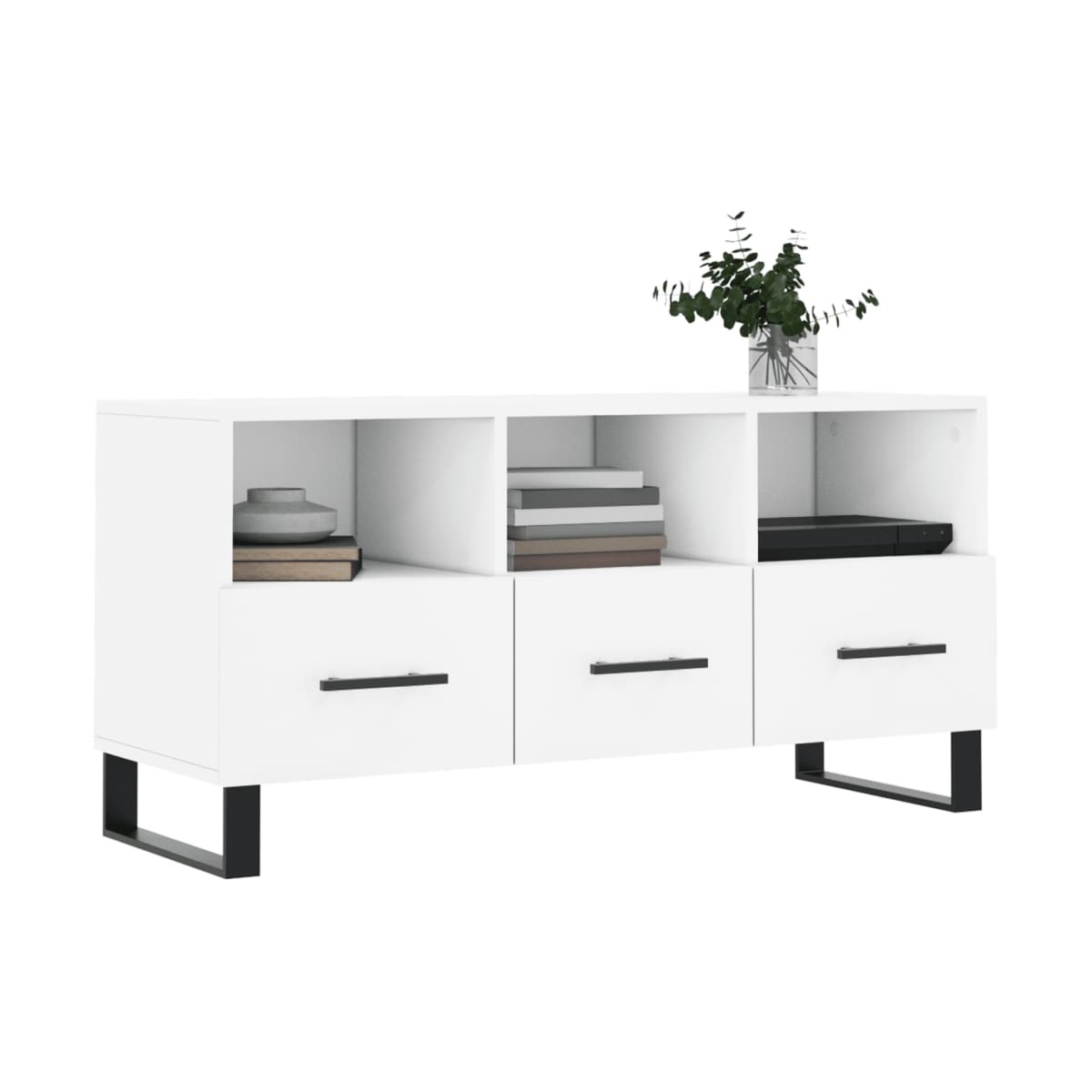 Este robusto mueble para TV está diseñado para ser el centro de atención de tu estancia, gracias a su diseño moderno a la par que práctico. Material robusto: La madera contrachapada tiene una calidad excepcional, con una superficie lisa y también cuenta con fuerza, estabilidad y resistencia a la humedad. Hecha de madera contrachapada, el mueble de TV es fácil de limpiar.Amplio espacio de almacenaje: El mueble de TV tiene 3 compartimentos y 3 cajones que lo convierten en un lugar ideal para guardar todas tus revistas, DVD y otros objetos.Función expositora: La resistente superficie del mueble es ideal para exhibir objetos decorativos como marcos de fotos y plantas.Patas de hierro: Las patas de hierro dan un estilo tranquilo a la casa, además de garantizar la estabilidad de la mesa. Advertencia:Para evitar el vuelco, este producto debe usarse con el dispositivo provisto para fijarlo a la pared.