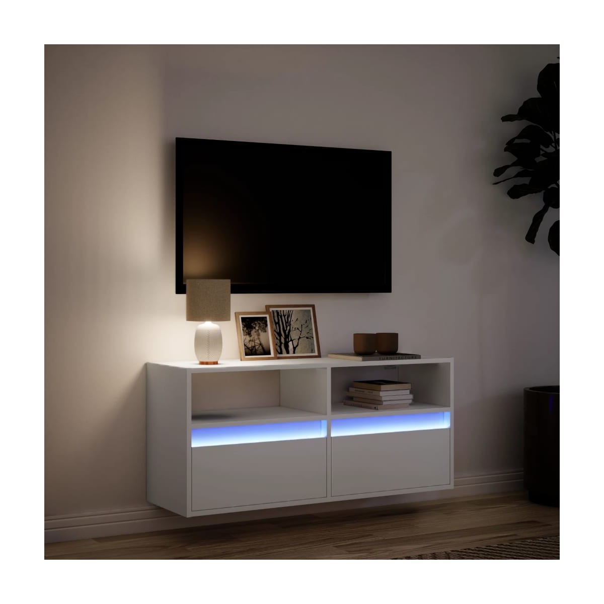 Este mueble de TV de pared es la solución perfecta para la casa, con el fin de maximizar el espacio y mantener el suelo despejado.Material estable y duradero: La madera de ingeniería es un material duradero y estable con una superficie lisa que es resistente a la humedad, la deformación y la rotura, lo que la convierte en una opción fiable para una variedad de proyectos.Luces LED RGB para un ambiente agradable: Este armario de TV cuenta con luces LED que se pueden ajustar fácilmente para crear un espectáculo de luces personalizado. Puedes personalizar los modos, los colores y el brillo para mejorar el ambiente de tu hogar.Amplio espacio de almacenamiento: Este soporte de TV tiene 2 cajones y 2 compartimentos, lo que proporciona un amplio espacio para guardar sus elementos esenciales diarios, como libros, DVD, revistas, suministros multimedia y otros artículos, perfectamente organizados y al alcance de la mano.Ahorro de espacio: El diseño de pared aprovecha al máximo el espacio no utilizado de la pared, convirtiéndolo en una zona de almacenamiento compacta y eficiente.Diseño DIY: El mueble de TV flotante ofrece infinitas opciones de diseño, lo que te permite utilizarlo solo o combinarlo con otros muebles altos de TV para crear un centro de entretenimiento completo.Información útil:Los tornillos y los tacos para el interior de la pared no están incluidos. Te recomendamos buscar y utilizar tornillos y tacos adecuados específicamente para tus paredes. Si no estás seguro, puedes consultar con un profesional. Lee y sigue cada paso de las instrucciones.El producto tiene un conector USB que necesita una fuente de alimentación USB certificada de 5 V (no incluida).