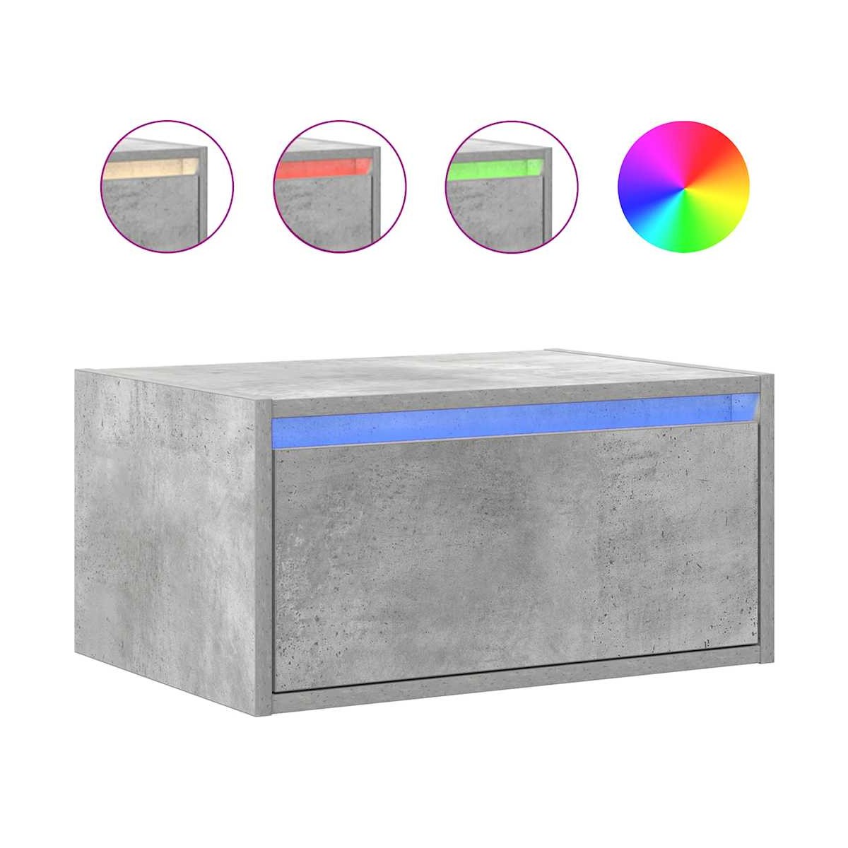 Mejora tu dormitorio con esta mesilla de noche de pared con luces LED. Complementa fácilmente cualquier estilo de muebles de tu hogar. Material estable y duradero: La madera de ingeniería es un material duradero y estable con una superficie lisa que es resistente a la humedad, la deformación y la rotura, lo que la convierte en una opción fiable para una variedad de proyectos.Amplio espacio de almacenamiento: La mesilla de noche ofrece un amplio espacio de almacenamiento para revistas, libros, gafas y otros objetos esenciales para la hora de dormir, manteniéndolos organizados y al alcance de la mano.Luces LED RGB para un ambiente agradable: las luces LED se pueden ajustar fácilmente para crear un espectáculo de luces personalizado. Puedes personalizar los modos, los colores y el brillo para mejorar el ambiente de tu espacio interior.Diseño de pared: La mesita de noche flotante se puede montar en la pared para agregar espacio de almacenamiento adicional. De esa forma, puedes liberar espacio en el piso y tener tu ambiente ordenado y limpio.Superficie resistente: La robusta parte superior de la mesilla de noche es perfecta para colocar lámparas de mesa, despertadores, libros, marcos de fotos, pequeñas plantas en macetas, adornos u otros objetos esenciales. Información útil:Los tornillos y los tacos para el interior de la pared no están incluidos. Recomendamos encontrar y utilizar tornillos y tacos adecuados específicamente para las paredes. Si no estás seguro, puedes consultar con un profesional. Lee y sigue cada paso de las instrucciones.El producto tiene un conector USB que necesita una fuente de alimentación USB certificada de 5 V (no incluida).