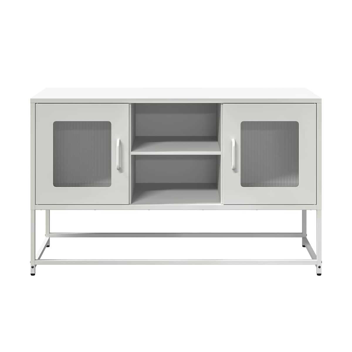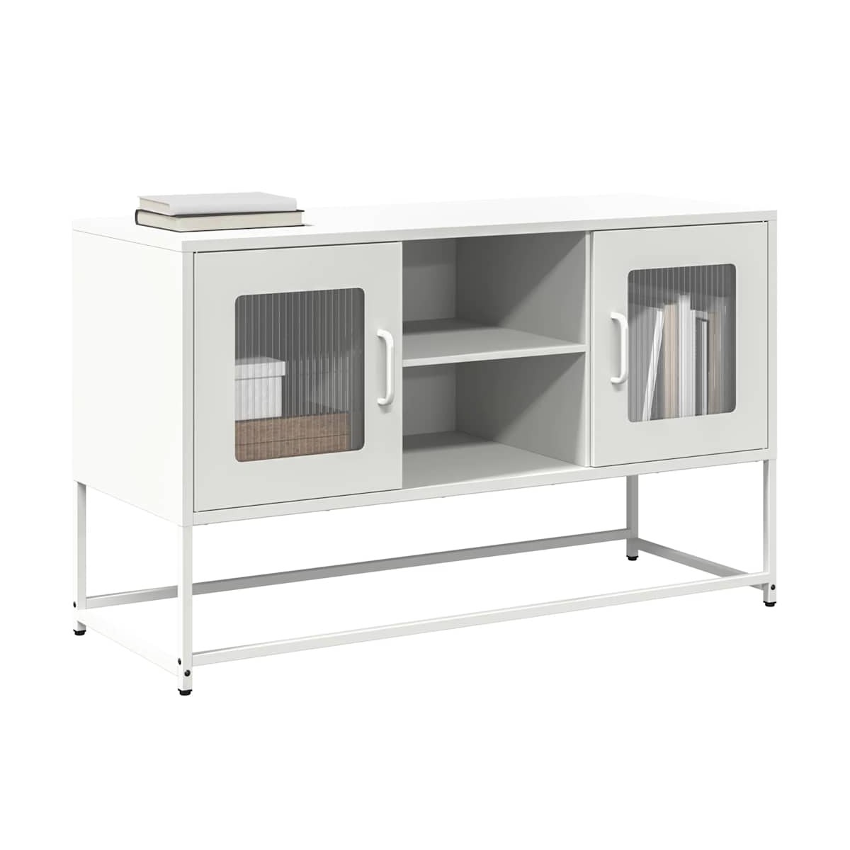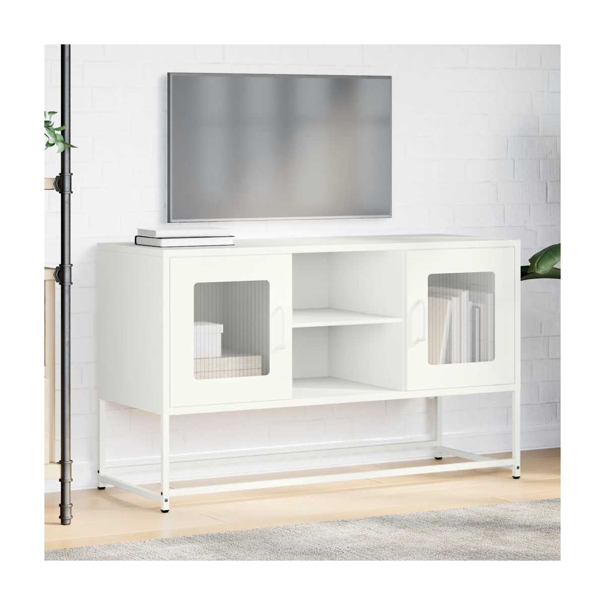 Este mueble de TV con amplio espacio de almacenamiento es un complemento práctico y llamativo para tu salón o dormitorio. Material robusto y estable: El acero laminado en frío es un tipo de acero con bajo contenido de carbono que se produce mediante el proceso de laminado en frío y se procesa a temperaturas ambiente casi normales. El acero laminado en frío tiene una superficie más lisa, mayor resistencia y mayor precisión.Amplio espacio de almacenamiento: este soporte de TV ofrece un amplio espacio de almacenamiento para mantener sus revistas, libros, DVD y dispositivos multimedia bien organizados y al alcance.Dos opciones de montaje: Los paneles laterales del mueble TV se pueden colocar en el lado izquierdo o derecho según tus necesidades.Puertas prácticas: Las dos puertas ayudan a mantener un espacio limpio y organizado ocultando pequeños objetos esenciales y desorden detrás de ellos.Tiradores metálicos: Este armario multimedia está equipado con tiradores metálicos para facilitar el acceso y añadir un elegante estilo industrial a su diseño. Advertencia:Para evitar que vuelque, este producto debe usarse con el dispositivo de fijación a la pared suministrado.