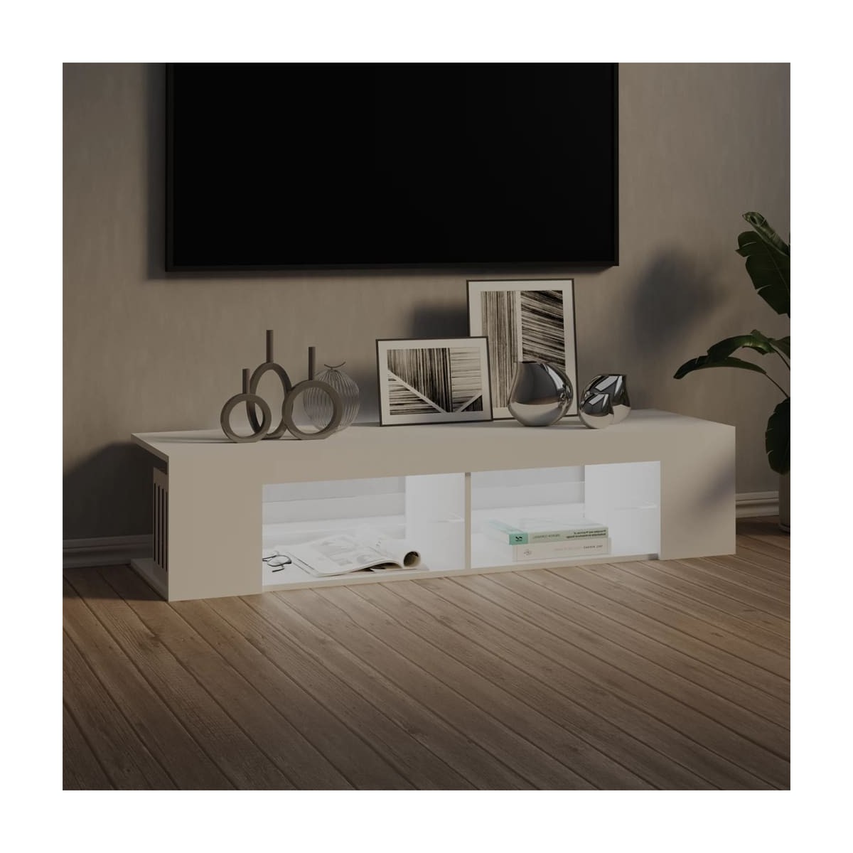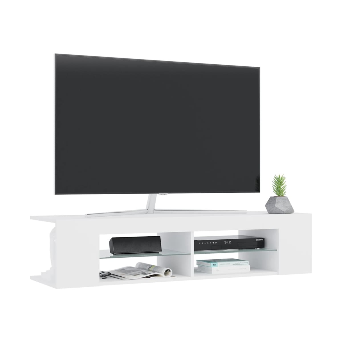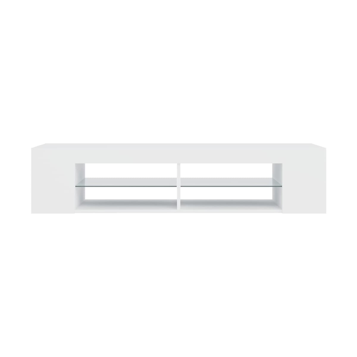 Con un diseño moderno y práctico, este mueble para la TV con luces LED definitivamente se conviertirá en el centro de atención de tu habitación. La construcción resistente de este mueble de televisor lo hace muy duradero. Tiene un amplio espacio para que puedas guardar tu reproductor de DVD, tu videoconsola, tu dispositivo de streaming y tus soportes multimedia de forma ordenada. Este soporte para TV cuenta con luces LED RGB, que tienen diferentes menús para cambiar el color de las luces y permitir que el color se ajuste automáticamente de manera diferente. Las luces LED subrayan el aspecto moderno y contribuyen a la sensación de moda. Además, este set es fácil de limpiar con un paño húmedo. Nota:El producto tiene un conector USB, pero no se incluye la fuente de alimentación USB de 5 V certificada.