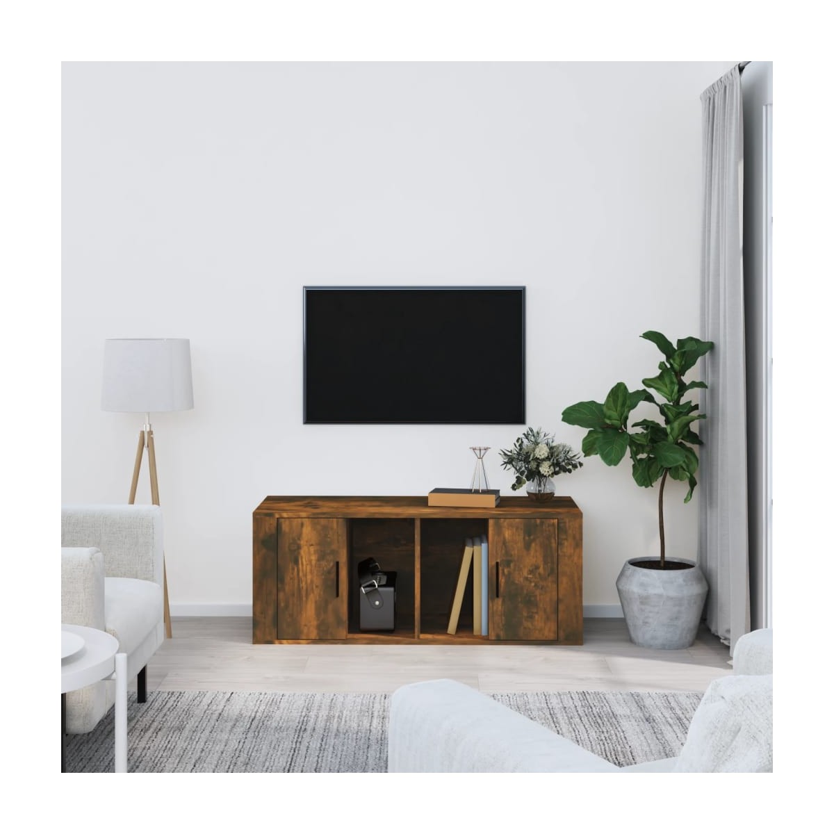 Este robusto mueble para TV está diseñado para ser el centro de atención de tu estancia, gracias a su diseño moderno a la par que práctico. Material robusto: La madera contrachapada tiene una calidad excepcional, con una superficie lisa y también cuenta con fuerza, estabilidad y resistencia a la humedad. Hecha de madera contrachapada, el mueble de TV es fácil de limpiar.Amplio almacenaje: El mueble de TV tiene 4 compartimentos que lo convierten en un lugar ideal para guardar todas tus revistas, DVD y otros artículos.Puerta práctica: Mantén tus objetos esenciales libres de polvo al ocultarlos detrás de la puerta de este armario de medios.Función expositora: El mueble multimedia cuenta con una robusta tapa donde puedes colocar elementos decorativos como marcos de fotos y plantas. Nota:Cada producto viene con un manual de montaje en la caja para facilitar el montaje.