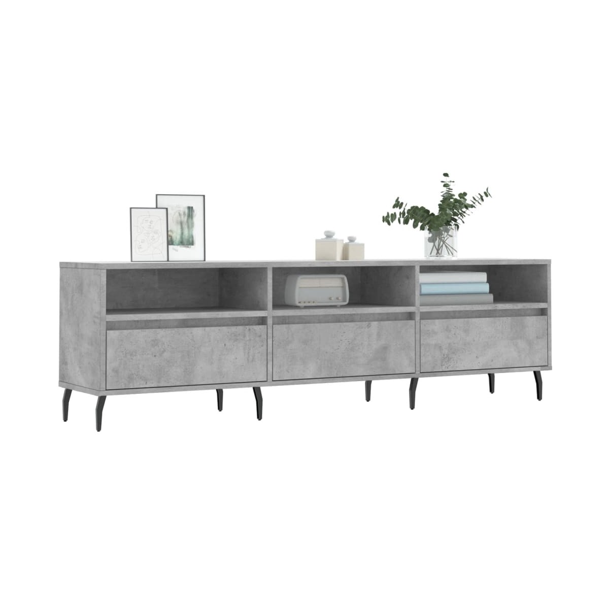 Este mueble de TV con amplio espacio de almacenamiento es un complemento práctico y llamativo para tu salón o dormitorio. Material robusto: La madera contrachapada tiene una calidad excepcional, con una superficie lisa y también cuenta con fuerza, estabilidad y resistencia a la humedad. Hecho de madera contrachapada, el mueble para TV es fácil de limpiar con un paño húmedo.Amplio espacio de almacenaje: Este banco de TV tiene 6 compartimentos, que ofrecen un amplio espacio de almacenaje para mantener revistas, libros, DVD y dispositivos multimedia bien organizados y al alcance.Superficie estable: La estable superficie del mueble de TV es perfecta para colocar libros, tazas y objetos decorativos.Patas de hierro: Las patas de hierro del mueble de TV garantizan su solidez y estabilidad.