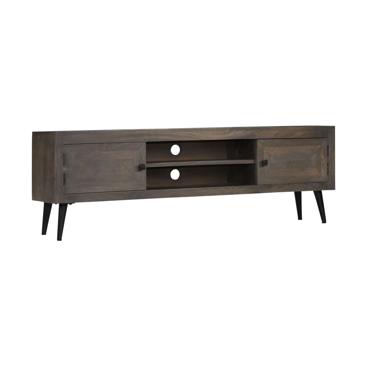 Este mueble de TV de madera maciza con lacado será una aporte distintivo y práctico para tu decoración. También se puede usar como aparador o como mueble de alta fidelidad. El mueble está hecho a mano de madera de mango que es maciza y la hace estable, duradera, bonita y su artesanía se añade a su espectacular estilo retro. Cada paso del proceso se lleva a cabo con el mayor cuidado, tanto el pulido o el barnizado. La artesanía y las bonitas vetas de la madera hacen que cada pieza de mobiliario sea única y ligeramente diferente del resto. Este mueble tiene una parte superior resistente, en la que puede colocar artículos decorativos como cestos de frutas o jarrones. Diseñado con 2 estantes y 2 armarios, este aparador le ofrece un amplio espacio para mantener sus artículos importantes organizados y al alcance. Cuenta con un agujero en la parte posterior para que pasen los cables. Sus patas de acero también contribuyen a su robustez y su impresionante estilo industrial. El montaje es fácil. Nota importante: Los colores y las vetas pueden variar de una pieza a otra, lo que hace que cada uno de nuestros muebles de TV sea único; la entrega es aleatoria.