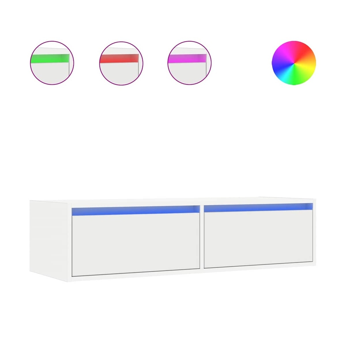 Con un diseño elegante y práctico, este mueble de TV con luces LED se convertirá en el centro de atención de la estancia. Material estable y duradero: La madera de ingeniería es un material duradero y estable con una superficie lisa que es resistente a la humedad, la deformación y la rotura, lo que la convierte en una opción fiable para una variedad de proyectos.Amplio espacio de almacenamiento: Este mueble de TV proporciona un amplio espacio de almacenamiento para mantener tus revistas, libros, DVD y dispositivos multimedia bien organizados y al alcance de la mano.Luces LED RGB para un ambiente agradable: Este armario cuenta con luces LED que se pueden ajustar fácilmente para crear un espectáculo de luces personalizado. Puedes personalizar los modos, los colores y el brillo para mejorar el ambiente de tu hogar.Ahorro de espacio: el mueble de TV se puede montar en la pared para añadir espacio de almacenamiento adicional. De esa manera, puedes maximizar el espacio del suelo y mantener el área limpia.Fácil de mantener: El soporte del televisor es fácil de limpiar con un paño húmedo y requiere menos mantenimiento. Información útil:Los tornillos y los tacos para el interior de la pared no están incluidos. Recomendamos encontrar y utilizar tornillos y tacos adecuados específicamente para las paredes. Si no estás seguro, puedes consultar con un profesional. Lee y sigue cada paso de las instrucciones.El producto tiene un conector USB que necesita una fuente de alimentación USB certificada de 5 V (no incluida).