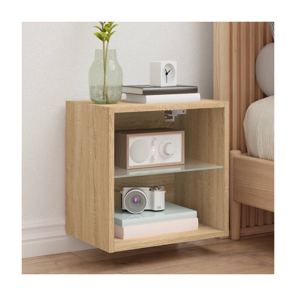 Con un diseño moderno y práctico, estas mesitas de noche con luces LED se convertirán en el foco de atención de la estancia. Material duradero: La madera de ingeniería tiene una calidad excepcional, con una superficie lisa y también cuenta con fuerza, estabilidad y resistencia a la humedad.Amplio espacio de almacenaje: Estas mesitas de noche ofrecen un práctico espacio de almacenaje para guardar bien organizados y al alcance revistas, mandos a distancia y otros objetos pequeños.Luces LED RGB: Estas mesitas de noche cuentan con luces LED RGB, que tienen diferentes menús para cambiar el color de las luces y permitir que el color se ajuste de forma automática.Función expositora: La robusta superficie de los muebles es ideal para poner objetos decorativos, marcos de fotos o plantas.Diseño de pared: Este mueble de dormitorio se puede colgar en la pared para ganar un plus de espacio de almacenaje. De este modo, podrás aprovechar al máximo el espacio del suelo y mantener la zona despejada. Información útil:Los tornillos y los tacos para el interior de la pared no están incluidos. Recomendamos encontrar y utilizar tornillos y tacos adecuados específicamente para las paredes. Si no estás seguro, puedes consultar con un profesional. Lee y sigue cada paso de las instrucciones.El producto tiene un conector USB que necesita una fuente de alimentación USB certificada de 5 V (no incluida).