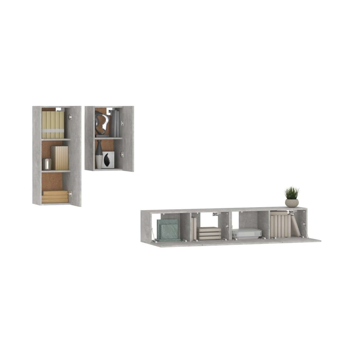 Este set de muebles de TV clásico está diseñado para ser el centro de atención de tu estancia, gracias a su diseño moderno a la par que práctico. Material robusto: La madera contrachapada tiene una calidad excepcional, con una superficie lisa y también cuenta con fuerza, estabilidad y resistencia a la humedad.Amplio espacio de almacenamiento: El conjunto de muebles de TV ofrece un amplio espacio de almacenamiento para mantener todas tus revistas, DVD y cualquier otro artículo bien organizados.Montaje en la pared: Estos muebles para TV no ocupan espacio en el suelo. Puedes colgarlo en la pared fácilmente. Nota:Los tornillos y los tacos para el interior de la pared no están incluidos. Busca y utiliza tornillos y tacos adecuados para tus paredes. Si no lo tienes claro, busca asesoramiento profesional. Lee y sigue cada paso de las instrucciones cuidadosamente.Cada producto viene con un manual de montaje en la caja para facilitar el montaje.