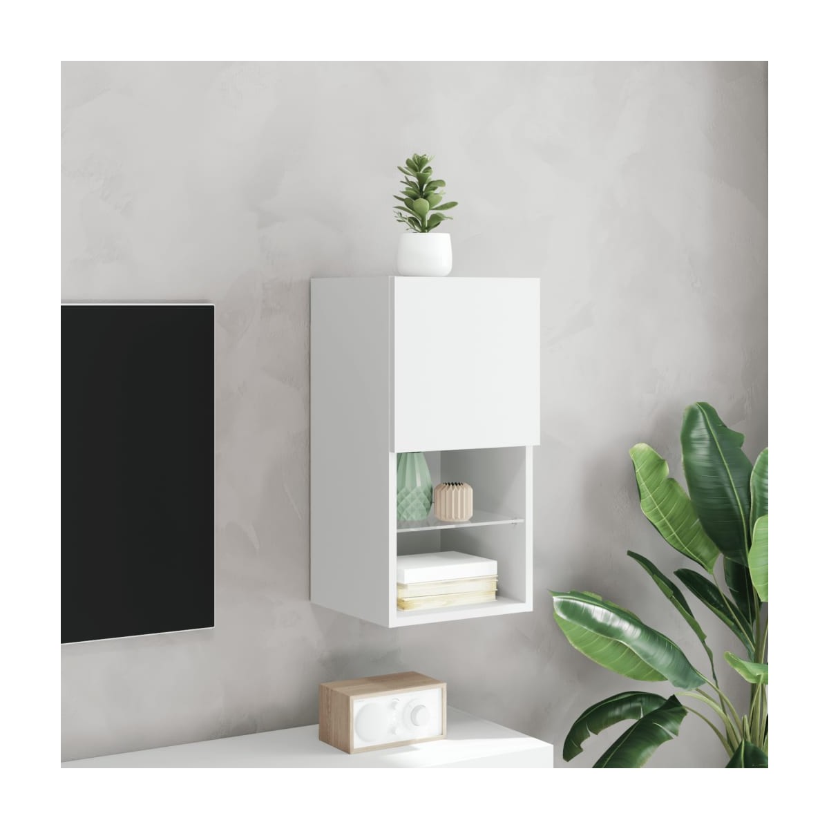 Con un diseño moderno y práctico, este mueble para la TV con luces LED se convertirá en el centro de atención de la estancia. Material duradero: La madera de ingeniería tiene una calidad excepcional y una superficie lisa, y también cuenta con fuerza, estabilidad y resistencia a la humedad. Hecho de madera de ingeniería, este soporte de TV es robusto y duradero.Amplio espacio de almacenaje: El mueble de TV ofrece un amplio espacio para mantener bien organizados y al alcance reproductores de DVD, receptores, discos y otros objetos pequeños.Luces LED RGB: Este mueble cuenta con luces LED RGB, con diferentes menús para cambiar el color de las luces y permitir que el color se ajuste de forma automática.Diseño de pared: Este mueble se puede colgar en la pared para conseguir espacio de almacenamiento extra. De esta manera, puedes maximizar el espacio en el suelo y mantener la zona despejada. Información útil:Los tornillos y los tacos para el interior de la pared no están incluidos. Recomendamos encontrar y utilizar tornillos y tacos adecuados específicamente para las paredes. Si no estás seguro, puedes consultar con un profesional. Lee y sigue cada paso de las instrucciones.El producto tiene un conector USB que necesita una fuente de alimentación USB certificada de 5 V (no incluida).