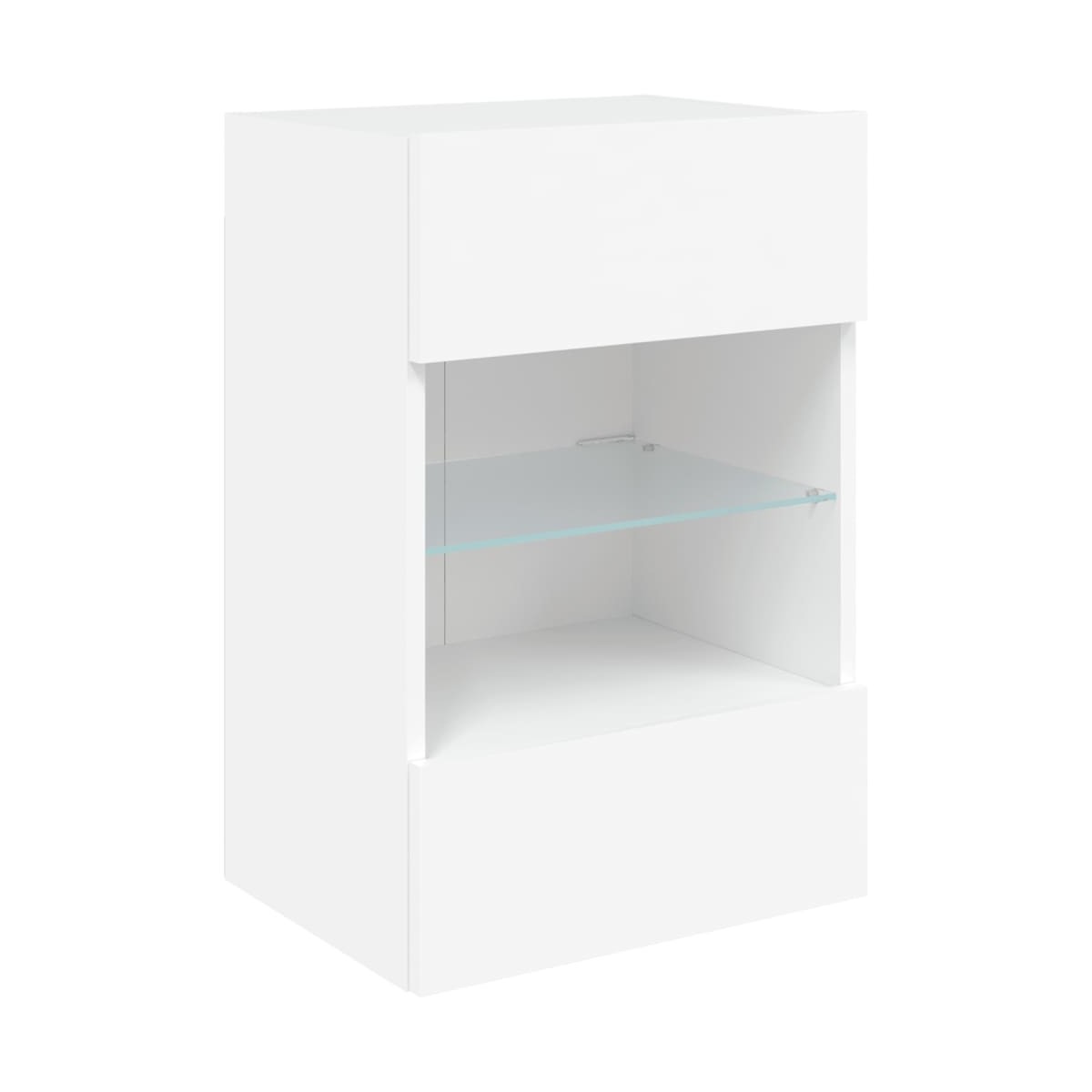 Este mueble de pared para TV es la solución perfecta para la casa, con el fin de maximizar el espacio y mantener el suelo despejado. Material duradero: La madera contrachapada tiene una calidad excepcional, con una superficie lisa y también cuenta con fuerza, estabilidad y resistencia a la humedad.Luces LED RGB: El mueble multimedia de pared está equipado con increíbles luces LED RGB. Con diversos menús personalizables, puedes cambiar el color de las luces sin esfuerzo e incluso hacer que se ajusten automáticamente. Estas luces LED no sólo realzan el aspecto moderno del mueble de TV flotante, sino que también le dan un toque a la moda.Amplio espacio de almacenaje: El mueble para TV de pared tiene un estante de vidrio y 2 compartimentos detrás de las puertas que ofrecen un amplio espacio para mantener organizadas y al alcance objetos pequeños, como libros, DVD y revistas.Versátil: El mueble es multiusos y puede utilizarse como mueble de pared para TV o como mesita de noche de pared. También puedes combinarlo con otros armarios para crear una impresionante pared en el salón.Diseño de pared: El armario con LED se puede montar en la pared para ganar un plus de espacio de almacenaje. De este modo, podrás aprovechar al máximo el espacio del suelo y mantener la zona limpia. Información útil:Los tornillos y los tacos para el interior de la pared no están incluidos. Recomendamos encontrar y utilizar tornillos y tacos adecuados específicamente para las paredes. Si no estás seguro, puedes consultar con un profesional. Lee y sigue cada paso de las instrucciones.El producto tiene un conector USB que necesita una fuente de alimentación USB certificada de 5 V (no incluida).