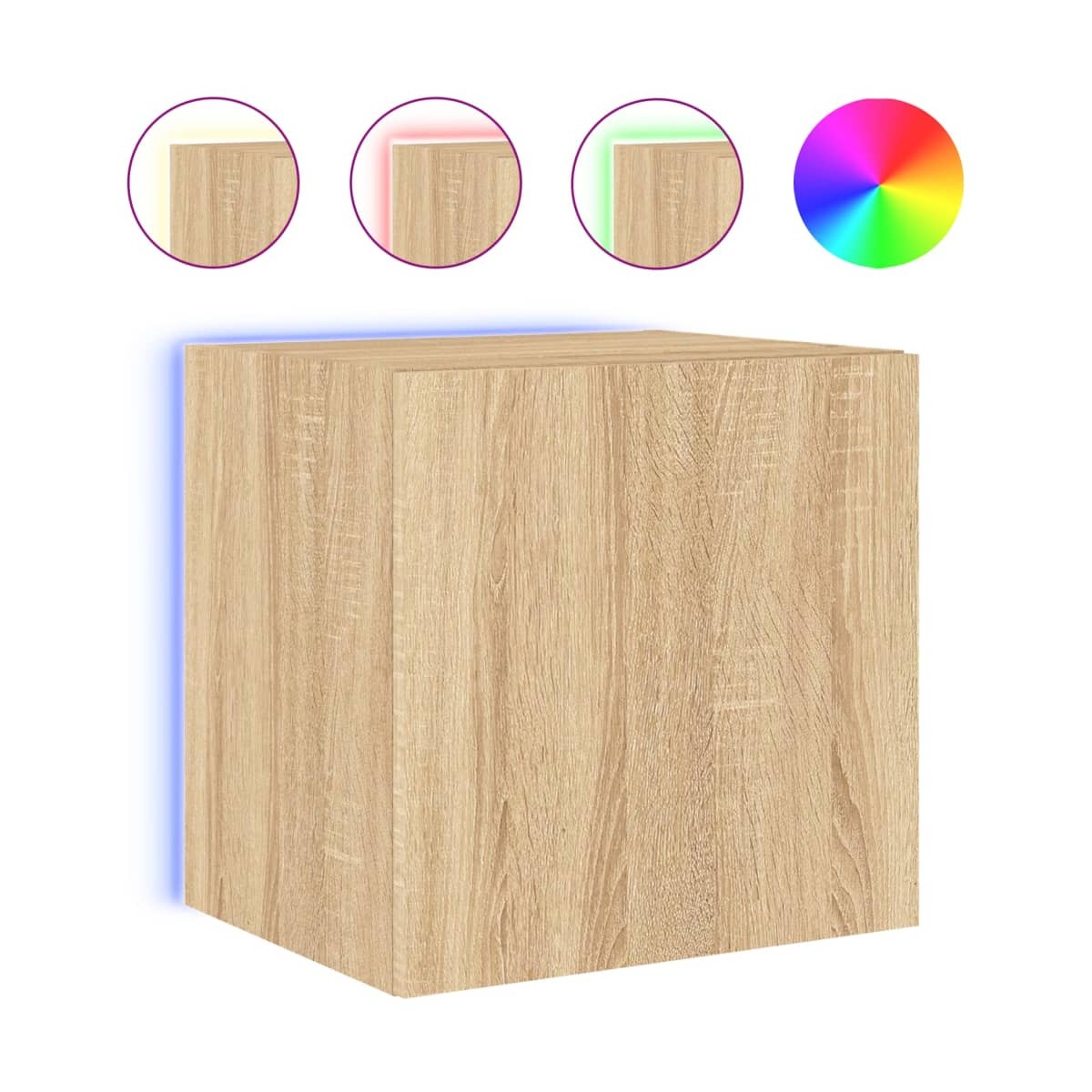 Este mueble de TV de pared es la solución perfecta para la casa, con el fin de maximizar el espacio y mantener el suelo despejado. Material duradero: La madera de ingeniería tiene una calidad excepcional, con una superficie lisa y también cuenta con fuerza, estabilidad y resistencia a la humedad.Luces LED RGB: El mueble multimedia de pared está equipado con increíbles luces LED RGB. Con diversos menús personalizables, puedes cambiar el color de las luces sin esfuerzo e incluso hacer que se ajusten automáticamente. Estas luces LED no sólo realzan el aspecto moderno del mueble de TV flotante, sino que también le dan un toque a la moda.Amplio espacio de almacenaje: El mueble para TV de pared tiene un compartimento detrás de las puertas que ofrece un amplio espacio para mantener organizadas y al alcance objetos pequeños, como libros, DVD y revistas.Versátil: El mueble es multiusos y puede utilizarse como mueble de pared para TV o como mesita de noche de pared. También puedes combinarlo con otros armarios para crear una impresionante pared en el salón.Diseño de pared: El armario con LED se puede montar en la pared para ganar un plus de espacio de almacenaje. De este modo, podrás aprovechar al máximo el espacio del suelo y mantener la zona limpia. Información útil:Los tornillos y los tacos para el interior de la pared no están incluidos. Recomendamos encontrar y utilizar tornillos y tacos adecuados específicamente para las paredes. Si no estás seguro, puedes consultar con un profesional. Lee y sigue cada paso de las instrucciones.El producto tiene un conector USB que necesita una fuente de alimentación USB certificada de 5 V (no incluida).