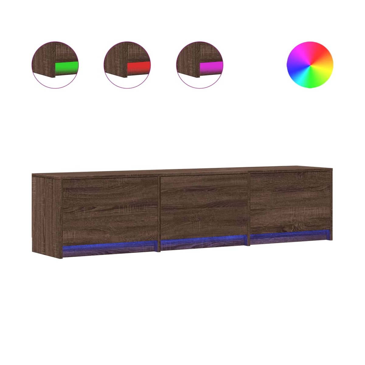 Con un diseño moderno y práctico, este mueble para la TV con luces LED definitivamente se conviertirá en el centro de atención de tu habitación. Material duradero:La madera de ingeniería tiene una calidad excepcional, con una superficie lisa y también con fuerza, estabilidad y resistencia a la humedad.Luces LED RGB para un ambiente agradable: Este soporte de TV cuenta con luces LED que se pueden ajustar fácilmente para crear un espectáculo de luces personalizado. Puedes personalizar los modos, los colores y el brillo para mejorar el ambiente de tu hogar.Amplio espacio de almacenamiento: Este mueble de TV proporciona un amplio espacio de almacenamiento para mantener tus revistas, libros, DVD y dispositivos multimedia bien organizados y al alcance de la mano.Superficie estable y resistente: La robusta superficie es ideal para colocar el televisor y el equipo de música o algunos objetos decorativos como jarrones o macetas. Información útil:El producto tiene un conector USB que necesita una fuente de alimentación USB certificada de 5 V (no incluida). Advertencia:Para evitar que vuelque, este producto debe usarse con el dispositivo de fijación a la pared suministrado.