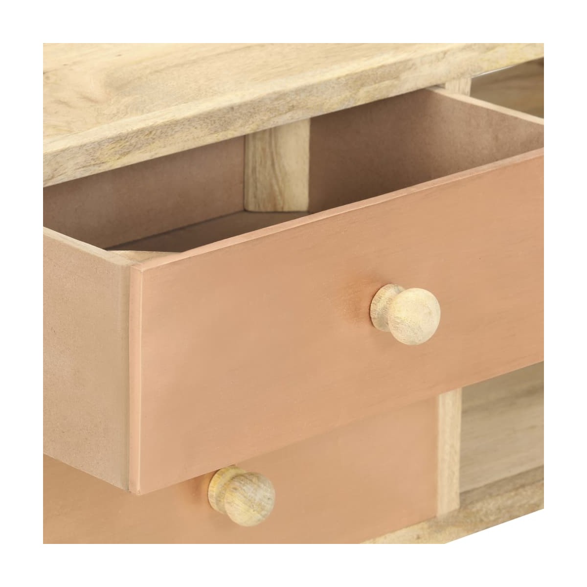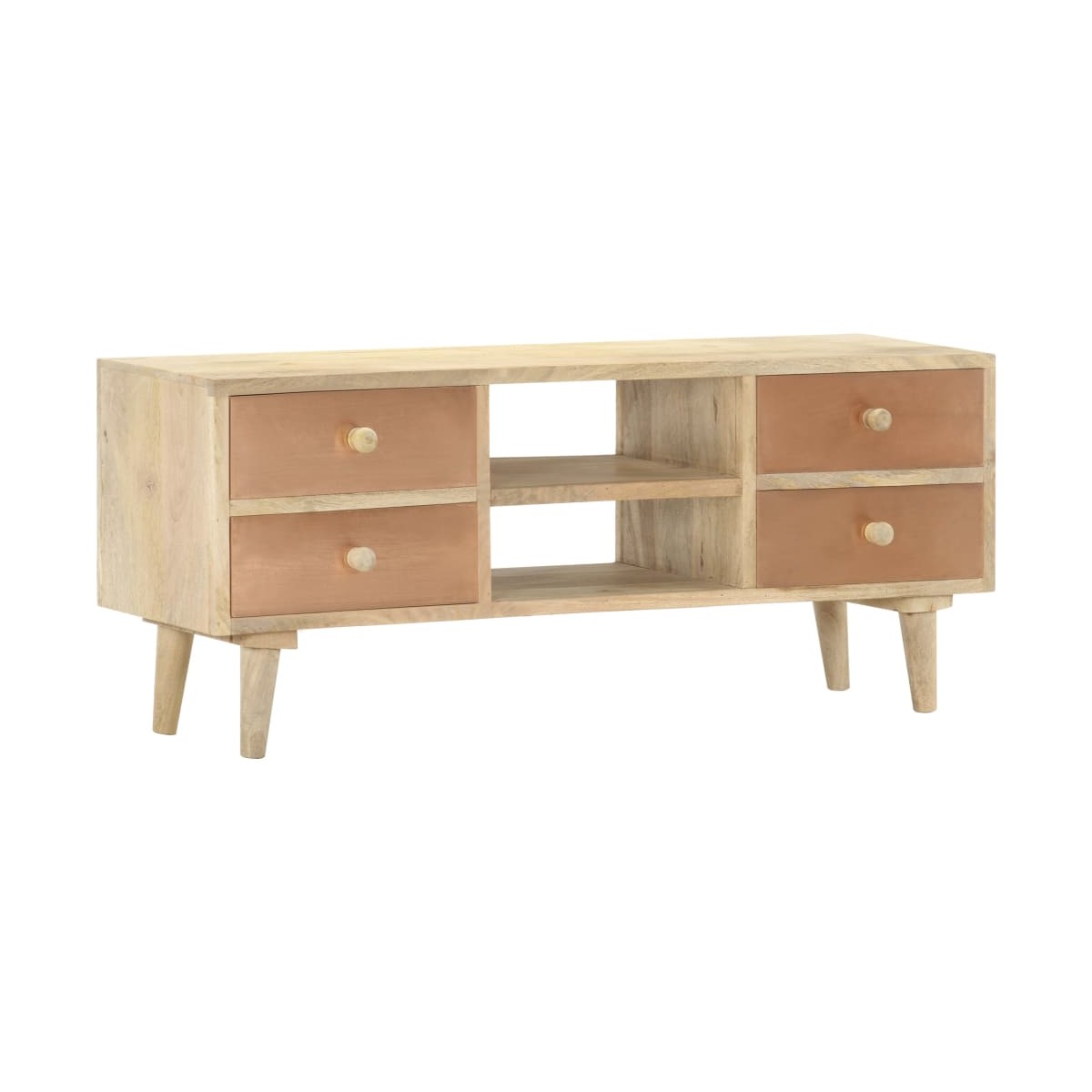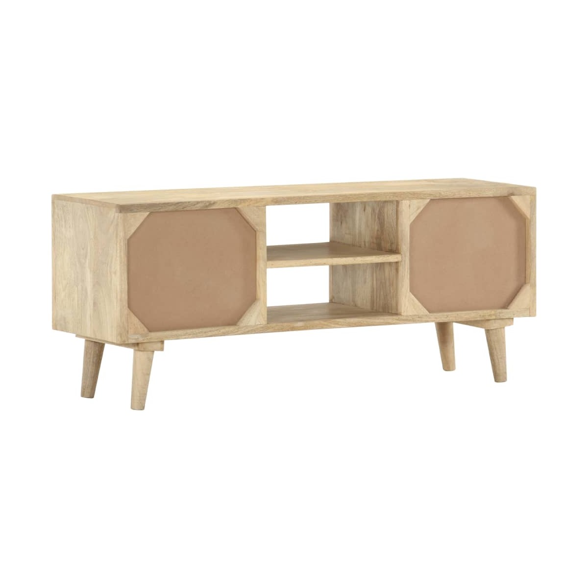 Si quieres dar un toque sencillo de encanto rústico a la decoración de tu hogar, ¡nuestro mueble de TV de madera de mango maciza es la mejor opción! La madera maciza de mango es una madera tropical. Por un lado, tiene fuerza para soportar peso y, por otro lado, soporta el desgaste y el paso del tiempo. Además, la exquisita artesanía y las bonitas vetas de la madera hacen que cada pieza sea ligeramente diferente del resto. El mueble para la TV está equipado con un amplio espacio de almacenamiento, por lo que puedes mostrar o guardar cualquier elemento que desees bien organizado. Nota importante: Los colores varían de una pieza a otra, haciendo que cada uno de nuestros soportes de TV de madera sea único.