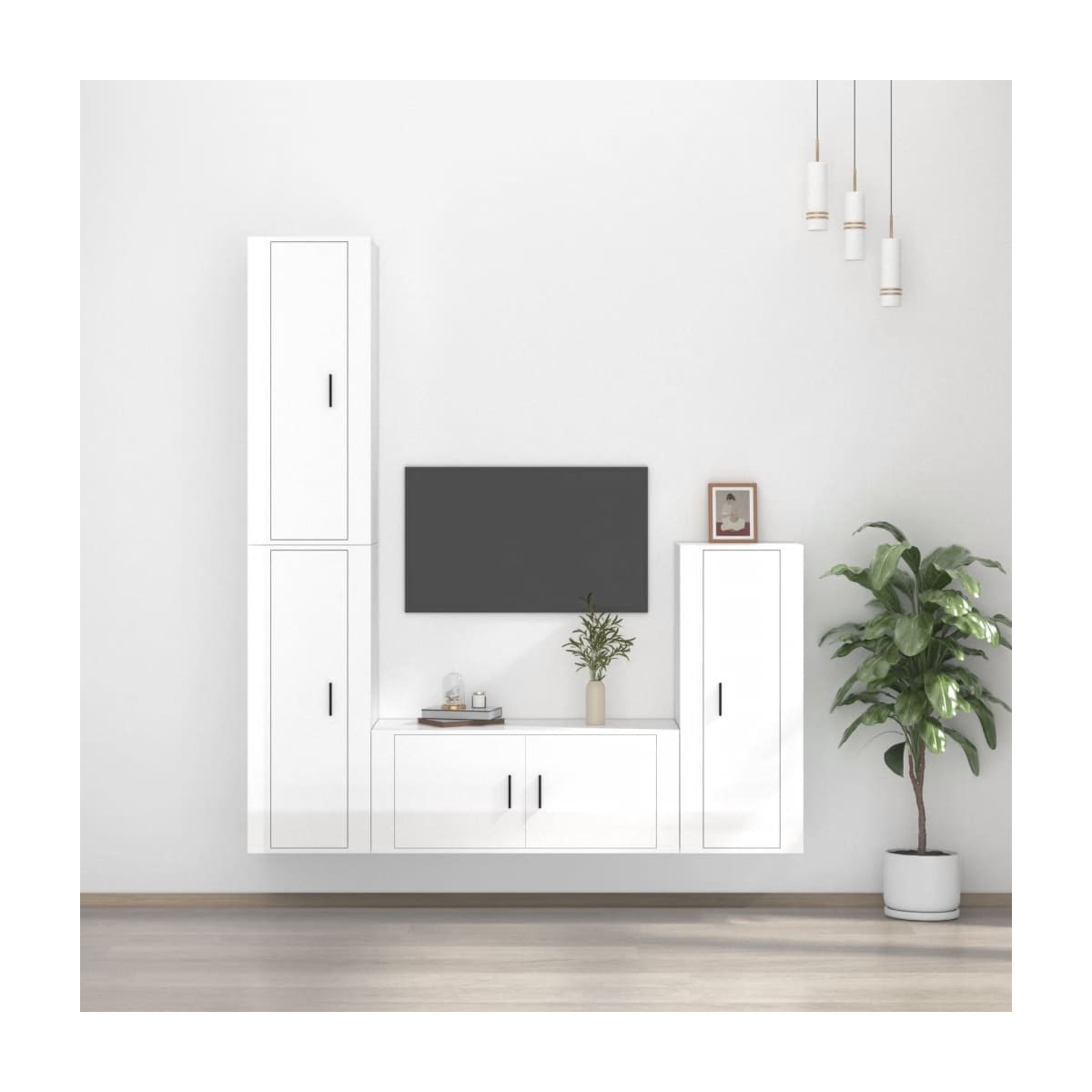 Este set de muebles de TV clásico está diseñado para ser el centro de atención de tu estancia, gracias a su diseño moderno a la par que práctico. Material robusto: La madera contrachapada tiene una calidad excepcional, con una superficie lisa y también cuenta con fuerza, estabilidad y resistencia a la humedad. Hechos de madera contrachapada, estos muebles de TV son fáciles de limpiar.Amplio espacio de almacenamiento: Estos muebles de TV ofrecen un amplio espacio de almacenamiento para mantener todas tus revistas, DVD y cualquier otro artículo bien organizados.Diseño montado en la pared: El armario multimedia no ocupa espacio en el suelo. Puedes colgarlo en la pared fácilmente.Puertas prácticas: Mantén tus objetos esenciales libres de polvo al ocultarlos detrás de la puerta del armario Información útil:Los tornillos y los tacos para el interior de la pared no están incluidos. Recomendamos encontrar y utilizar tornillos y tacos adecuados específicamente para las paredes. Si no estás seguro, puedes consultar con un profesional. Lee y sigue cada paso de las instrucciones.