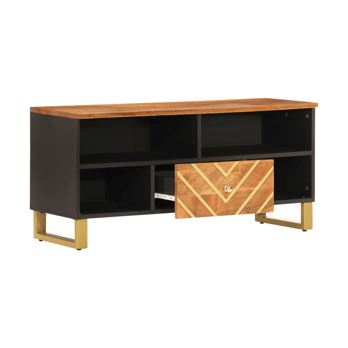 Este robusto mueble para TV está diseñado para ser el centro de atención de tu estancia, gracias a su diseño moderno a la par que práctico. Madera maciza de mango: La madera maciza de mango es una madera dura, tropical y resistente, que sirve para hacer muebles robustos. Las bonitas vetas de la madera hacen que cada mueble sea ligeramente diferente al resto. Hecho de madera maciza de mango, el mueble para el televisor es duradero y estable.Almacenamiento espacioso: El mueble de TV tiene un amplio espacio de almacenaje que lo convierte en un lugar ideal para guardar todas tus revistas, DVDs y otros artículos.Función expositora: La resistente superficie del mueble es ideal para exhibir objetos decorativos como marcos y plantas.Patas robustass: Las patas de hierro añaden robustez y estabilidad al mueble de TV.