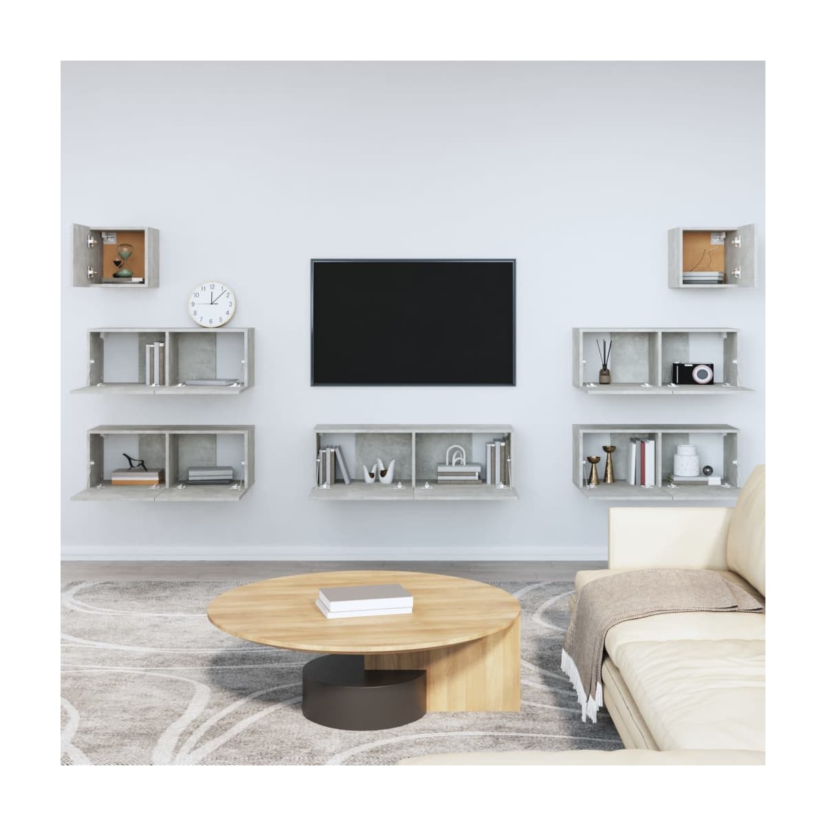 Este set de muebles de TV clásico está diseñado para ser el centro de atención de tu estancia, gracias a su diseño moderno a la par que práctico. Material robusto: La madera contrachapada tiene una calidad excepcional, con una superficie lisa y también cuenta con fuerza, estabilidad y resistencia a la humedad.Amplio espacio de almacenamiento: El conjunto de muebles de TV ofrece un amplio espacio de almacenamiento para mantener todas tus revistas, DVD y cualquier otro artículo bien organizados.Montaje en la pared: Estos muebles para TV no ocupan espacio en el suelo. Puedes colgarlo en la pared fácilmente. Nota:Los tornillos y los tacos para el interior de la pared no están incluidos. Busca y utiliza tornillos y tacos adecuados para tus paredes. Si no lo tienes claro, busca asesoramiento profesional. Lee y sigue cada paso de las instrucciones cuidadosamente.Cada producto viene con un manual de montaje en la caja para facilitar el montaje.