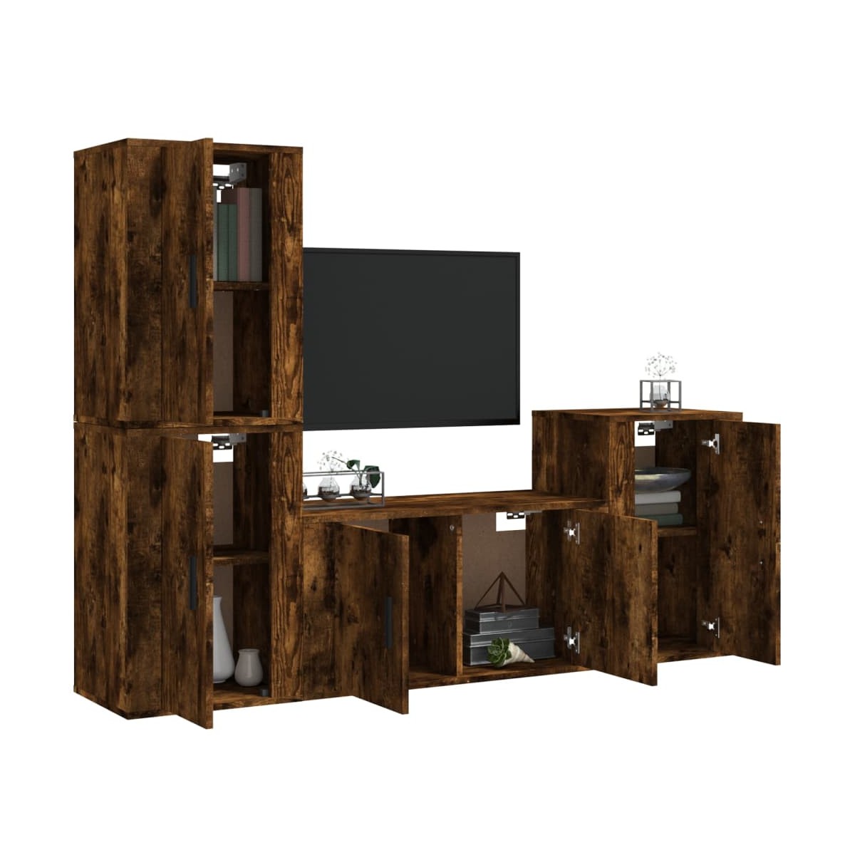 Este set de muebles de TV clásico está diseñado para ser el centro de atención de tu estancia, gracias a su diseño moderno a la par que práctico. Material robusto: La madera contrachapada tiene una calidad excepcional, con una superficie lisa y también cuenta con fuerza, estabilidad y resistencia a la humedad.Amplio espacio de almacenamiento: El conjunto de muebles de TV ofrece un amplio espacio de almacenamiento para mantener todas tus revistas, DVD y cualquier otro artículo bien organizados.Montaje en la pared: Estos muebles para TV no ocupan espacio en el suelo. Puedes colgarlo en la pared fácilmente. Información útil:Para facilitar al máximo el montaje, cada producto se entrega con un manual.Los tornillos y los tacos para el interior de la pared no están incluidos. Recomendamos encontrar y utilizar tornillos y tacos adecuados específicamente para las paredes. Si no estás seguro, puedes consultar con un profesional. Lee y sigue cada paso de las instrucciones.