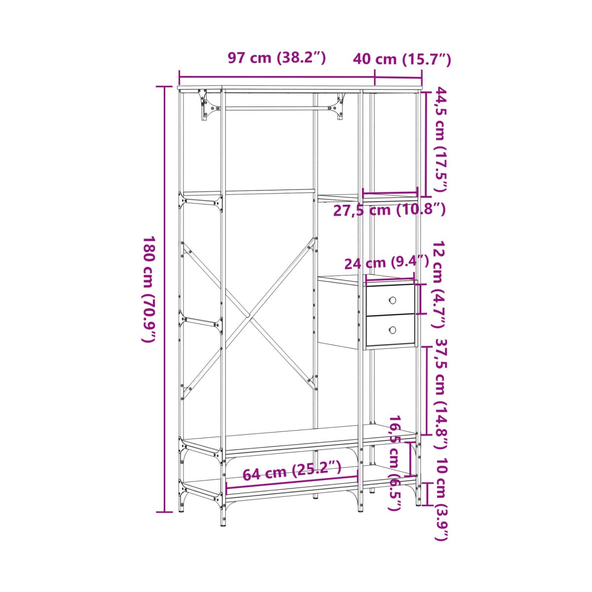 - Dimensiones: 97 x 40 x 180 cm (largo x ancho x alto)