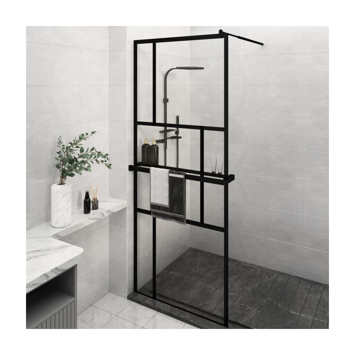 ¡Da una estética fresca al baño con nuestra moderna mampara de ducha con estante! Material resistente: Con una estructura inteligente, el vidrio ESG es más resistente y duradero que cualquier otro vidrio. El vidrio ESG es conocido por soportar fuerzas como fuertes impactos, rayones, golpes, etc.Estructura estable: La mampara de ducha se sujeta por una estructura de aluminio, por lo que puedes estar seguro de que la estructura se mantendrá fuerte una vez montada. El aluminio es ligero y fuerte. Es resistente a la corrosión gracias a una capa de óxido autoprotectora.Diseño flexible: El perfil ajustable y la barra de soporte flexible hacen que la mampara de ducha se adapte fácilmente a cualquier tamaño y diseño de baño.Función práctica: El estante de ducha para la mampara de ducha de baño es una excelente opción para colocar artículos de baño como toallas, champú, acondicionador, limpiadores faciales y otros productos para el cuidado de la piel.Diseño minimalista: Las líneas limpias y el aspecto sencillo hacen que la mampara de ducha se integre en el cuarto de baño a la perfección. Información útil:Para facilitar al máximo el montaje, cada producto se entrega con un manual.