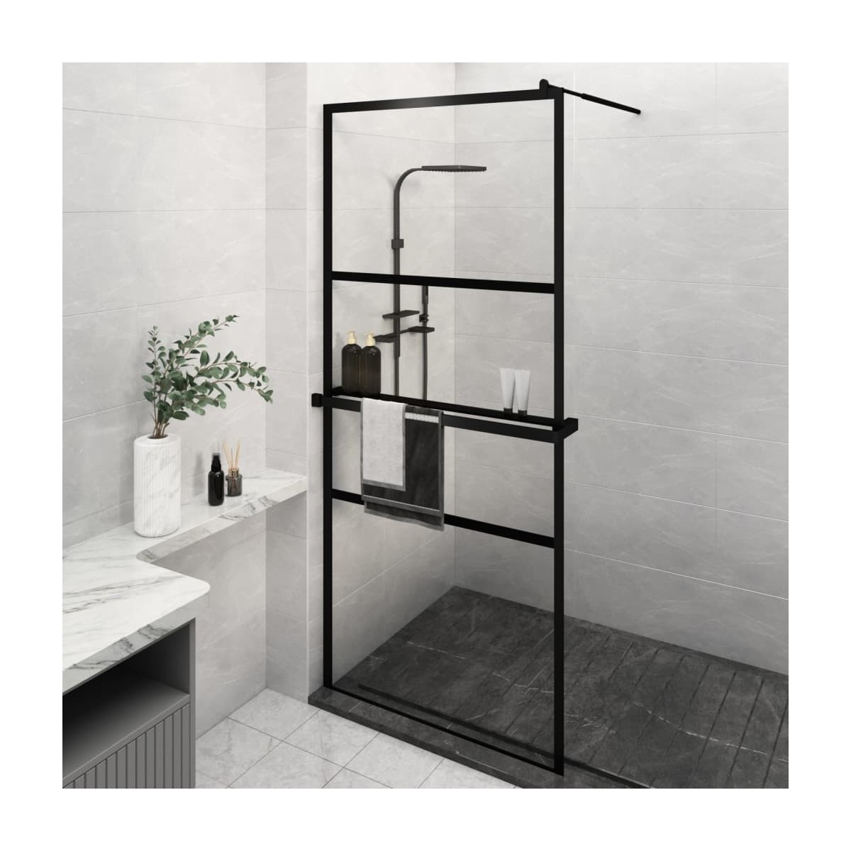 ¡Da una estética fresca al baño con nuestra moderna mampara de ducha con estante! Material resistente: Con una estructura inteligente, el vidrio ESG es más resistente y duradero que cualquier otro vidrio. El vidrio ESG es conocido por soportar fuerzas como fuertes impactos, rayones, golpes, etc.Estructura estable: La mampara de ducha se sujeta por una estructura de aluminio, por lo que puedes estar seguro de que la estructura se mantendrá fuerte una vez montada. El aluminio es ligero y fuerte. Es resistente a la corrosión gracias a una capa de óxido autoprotectora.Diseño flexible: El perfil ajustable y la barra de soporte flexible hacen que la mampara de ducha se adapte fácilmente a cualquier tamaño y diseño de baño.Función práctica: El estante de ducha para la mampara de ducha de baño es una excelente opción para colocar artículos de baño como toallas, champú, acondicionador, limpiadores faciales y otros productos para el cuidado de la piel.Diseño minimalista: Las líneas limpias y el aspecto sencillo hacen que la mampara de ducha se integre en el cuarto de baño a la perfección. Información útil:Para facilitar al máximo el montaje, cada producto se entrega con un manual.
