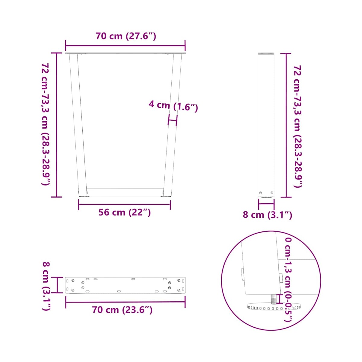 Estas patas para mesa de comedor combinan forma y función. Son una opción ideal para personalizar tu mesa de comedor. Material duradero: esta pata de mesa de comedor está hecha de acero con recubrimiento en polvo, lo que la hace resistente y duradera.Diseño práctico: esta pata de mesa de comedor incluye niveladores de pie ajustables, lo que garantiza la estabilidad incluso en suelos irregulares y minimiza los arañazos en el suelo. Además, el soporte cuenta con orificios pretaladrados y tornillos incluidos en la entrega, que se pueden utilizar para fijar la pata al tablero de la mesa (no incluidos), lo que facilita el montaje.Estética moderna: La pata de la mesa ofrece un aspecto elegante y contemporáneo. Sus líneas limpias y su diseño geométrico realzan el aspecto general del mueble. Información útil:La entrega solo contiene las patas de la mesa, el tablero no está incluido.