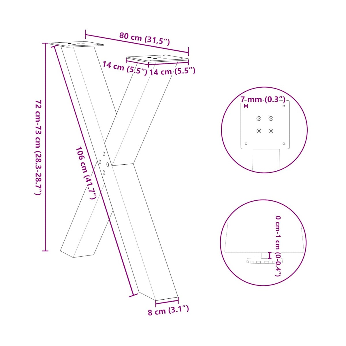 Estas patas para mesa de comedor combinan forma y función. Son una opción ideal para personalizar tu mesa de comedor. Material duradero: esta pata de mesa de mobiliario está hecha de acero con recubrimiento en polvo, lo que la hace resistente y duradera.Estructura robusta: el diseño en forma de X de la pata de la mesa de metal garantiza que pueda soportar una mesa pesada.Diseño práctico: esta pata de escritorio incluye niveladores de pie ajustables, lo que garantiza la estabilidad incluso en suelos irregulares y minimiza los arañazos en el suelo. Además, el soporte cuenta con orificios pretaladrados y tornillos incluidos en la entrega, que se pueden utilizar para fijar la pata al tablero de la mesa (no incluidos), lo que facilita el montaje.Estética moderna: La pata de la mesa tiene líneas limpias y un diseño geométrico que mejora el aspecto general del mueble. Además, combina bien con cualquier tablero de mesa de un tamaño adecuado. Información útil:La entrega solo contiene las patas de la mesa, el tablero no está incluido.