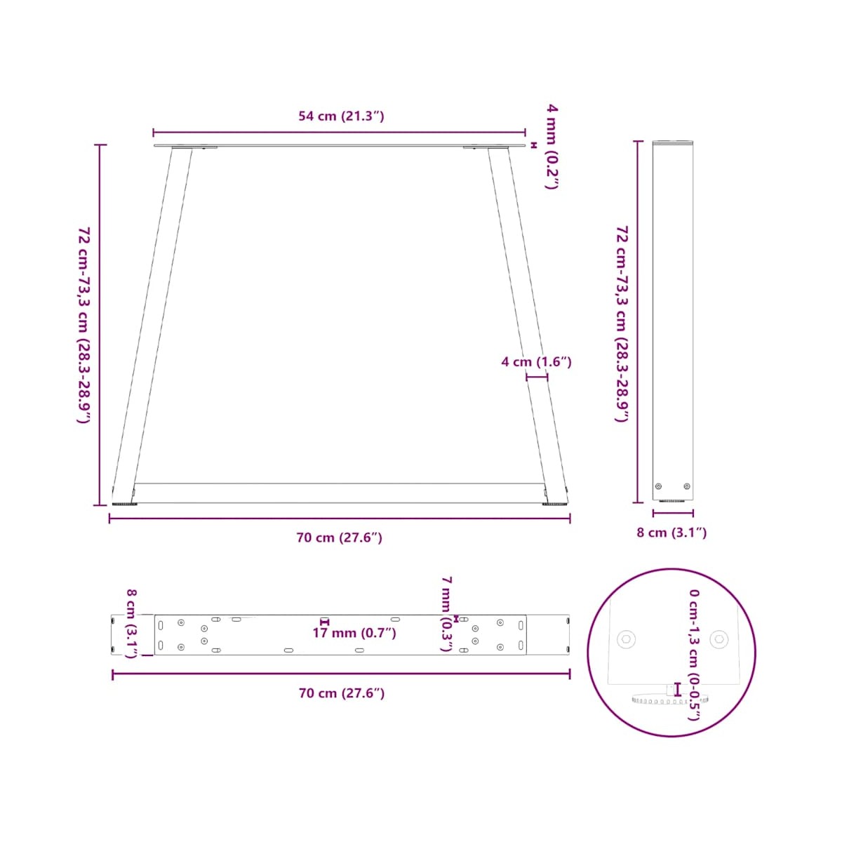 Estas patas para mesa de comedor combinan forma y función. Son una opción ideal para personalizar tu mesa de comedor. Material duradero: esta pata de mesa de comedor está hecha de acero con recubrimiento en polvo, lo que la hace resistente y duradera.Diseño práctico: esta pata de mesa de comedor incluye niveladores de pie ajustables, lo que garantiza la estabilidad incluso en suelos irregulares y minimiza los arañazos en el suelo. Además, el soporte cuenta con orificios pretaladrados y tornillos incluidos en la entrega, que se pueden utilizar para fijar la pata al tablero de la mesa (no incluidos), lo que facilita el montaje.Estética moderna: La pata de la mesa ofrece un aspecto elegante y contemporáneo. Sus líneas limpias y su diseño geométrico realzan el aspecto general del mueble. Información útil:La entrega solo contiene las patas de la mesa, el tablero no está incluido.