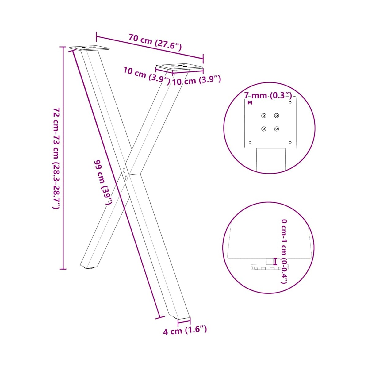 Estas patas para mesa de comedor combinan forma y función. Son una opción ideal para personalizar tu mesa de comedor. Material duradero: esta pata de mesa de mobiliario está hecha de acero con recubrimiento en polvo, lo que la hace resistente y duradera.Estructura robusta: el diseño en forma de X de la pata de la mesa de metal garantiza que pueda soportar una mesa pesada.Diseño práctico: esta pata de escritorio incluye niveladores de pie ajustables, lo que garantiza la estabilidad incluso en suelos irregulares y minimiza los arañazos en el suelo. Además, el soporte cuenta con orificios pretaladrados y tornillos incluidos en la entrega, que se pueden utilizar para fijar la pata al tablero de la mesa (no incluidos), lo que facilita el montaje.Estética moderna: La pata de la mesa tiene líneas limpias y un diseño geométrico que mejora el aspecto general del mueble. Además, combina bien con cualquier tablero de mesa de un tamaño adecuado. Información útil:La entrega solo contiene las patas de la mesa, el tablero no está incluido.