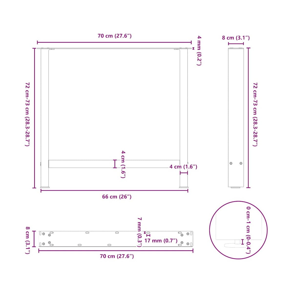 Estas patas para mesa de centro combinan forma y función. Son una opción ideal para personalizar tu mesa de centro. Material duradero: esta pata de mesa de café está hecha de acero con recubrimiento en polvo, lo que la hace resistente y duradera.Estructura robusta: el diseño cuadrado de la pata de la mesa de café garantiza que pueda soportar una mesa pesada.Diseño práctico: esta pata para mesa de centro incluye niveladores de pie ajustables, lo que garantiza la estabilidad incluso en suelos irregulares y minimiza los arañazos en el suelo. Además, el soporte cuenta con orificios pretaladrados y tornillos incluidos en la entrega, que se pueden utilizar para fijar la pata al tablero de la mesa (no incluidos), lo que facilita el montaje.Estética moderna: La pata de la mesa tiene líneas limpias y un diseño geométrico que mejora el aspecto general del mueble. Además, combina bien con cualquier tablero de mesa de un tamaño adecuado.Información útil:La entrega solo contiene las patas de la mesa, el tablero no está incluido.