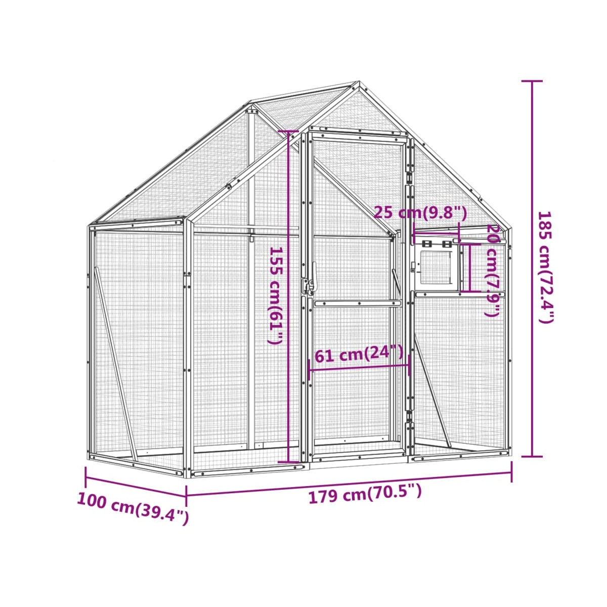 Esta pajarera proporciona un lugar acogedor y cómodo para que tus pájaros vuelen y jueguen de forma segura. Estructura robusta: El aluminio es ligero y fuerte, y resistente a la corrosión gracias a su capa de óxido autoprotectora. Gracias a la robusta estructura de aluminio, esta pajarera es muy duradera.Rejilla de malla metálica: La jaula para periquitos está equipada con rejillas de malla metálica que evitan travesuras y accidentes inesperados. Asimismo, también te permiten observar a los pájaros cada día y les garantizan un amplio campo de visión y suficiente aire fresco.Amplio espacio de actividad: La jaula para loros ofrece a tus pájaros un espacio amplio para pasear, jugar y volar con facilidad. Además, también sirve para otros animales pequeños como conejos, patos, gallinas, gansos, etc.Puerta y ventana con cierre: La puerta con bisagras y sistema de cierre con pestillo de la gran jaula para pájaros garantiza un plus de seguridad y de protección para los pájaros. La jaula grande para loros también tiene una ventana con cierre para darles de comer con facilidad.