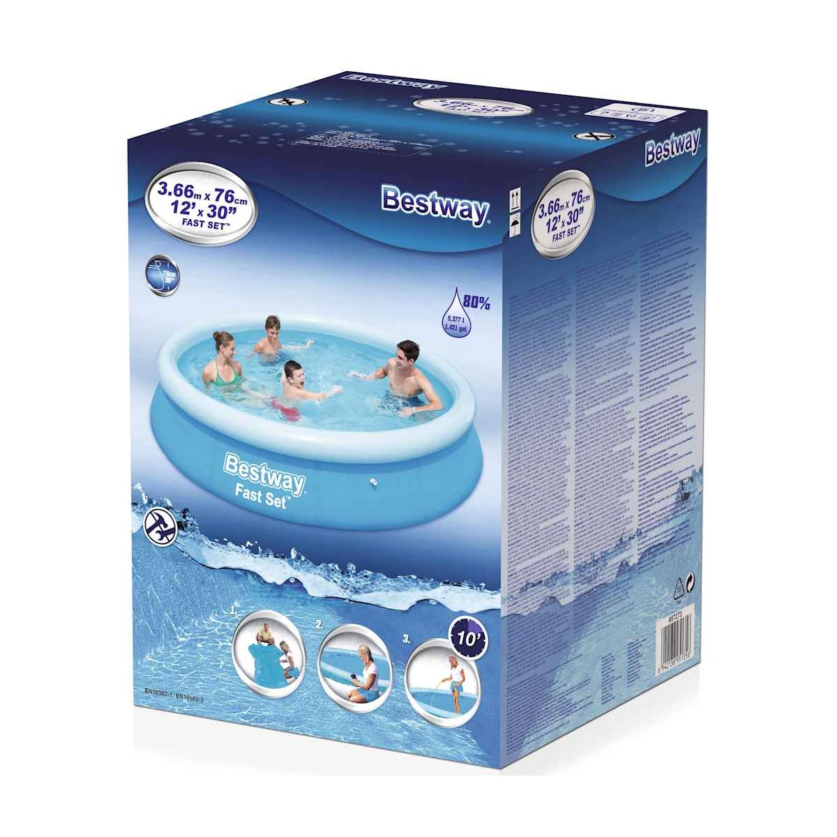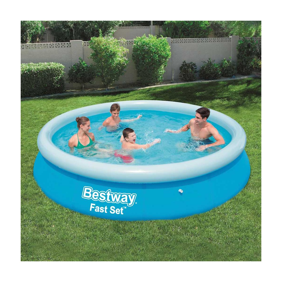 Diviértete mucho en el patio con familiares y amigos en esta piscina inflable de Bestway, modelo Fast Set 57273. La elegante piscina tiene paredes reforzadas hechas de Tritech, un material reforzado de 3 capas que consiste en PVC laminado de alta resistencia y una malla de poliéster. Esta piscina inflable se puede montar de forma rápida y sencilla. Simplemente coloca la piscina sobre una superficie plana, infla el anillo superior y luego llena la piscina con agua. La piscina es fácil de plegar para guardarla y transportarla cuando no se use.