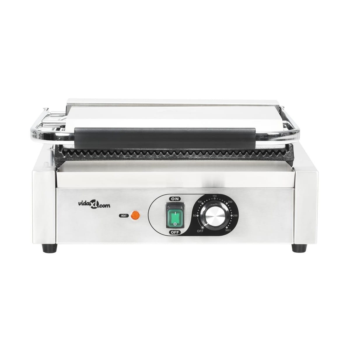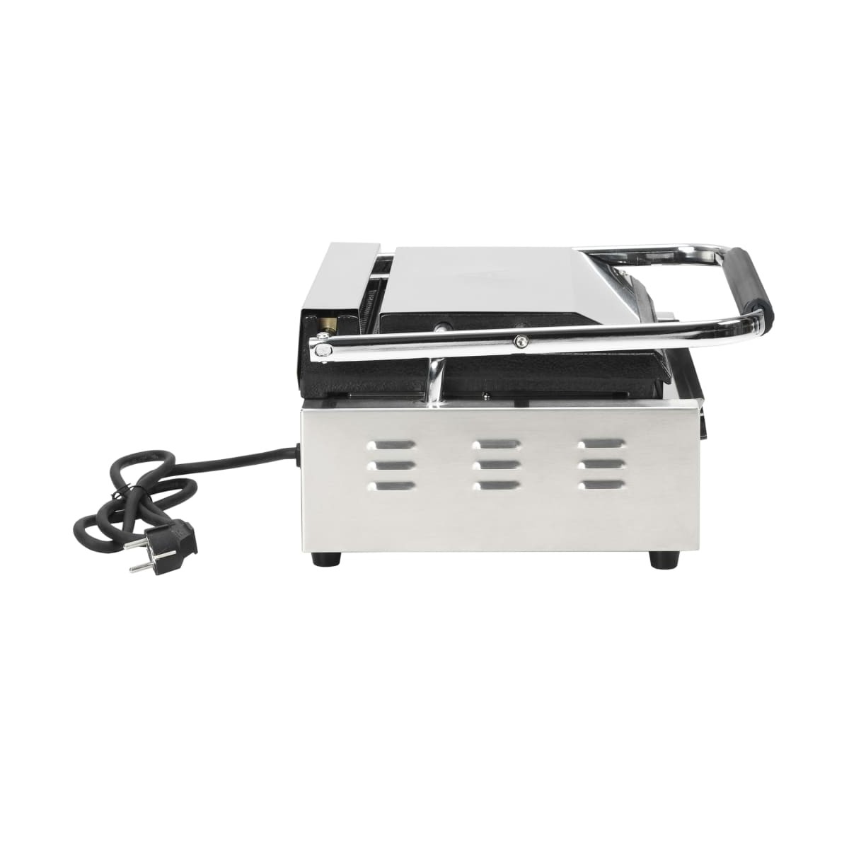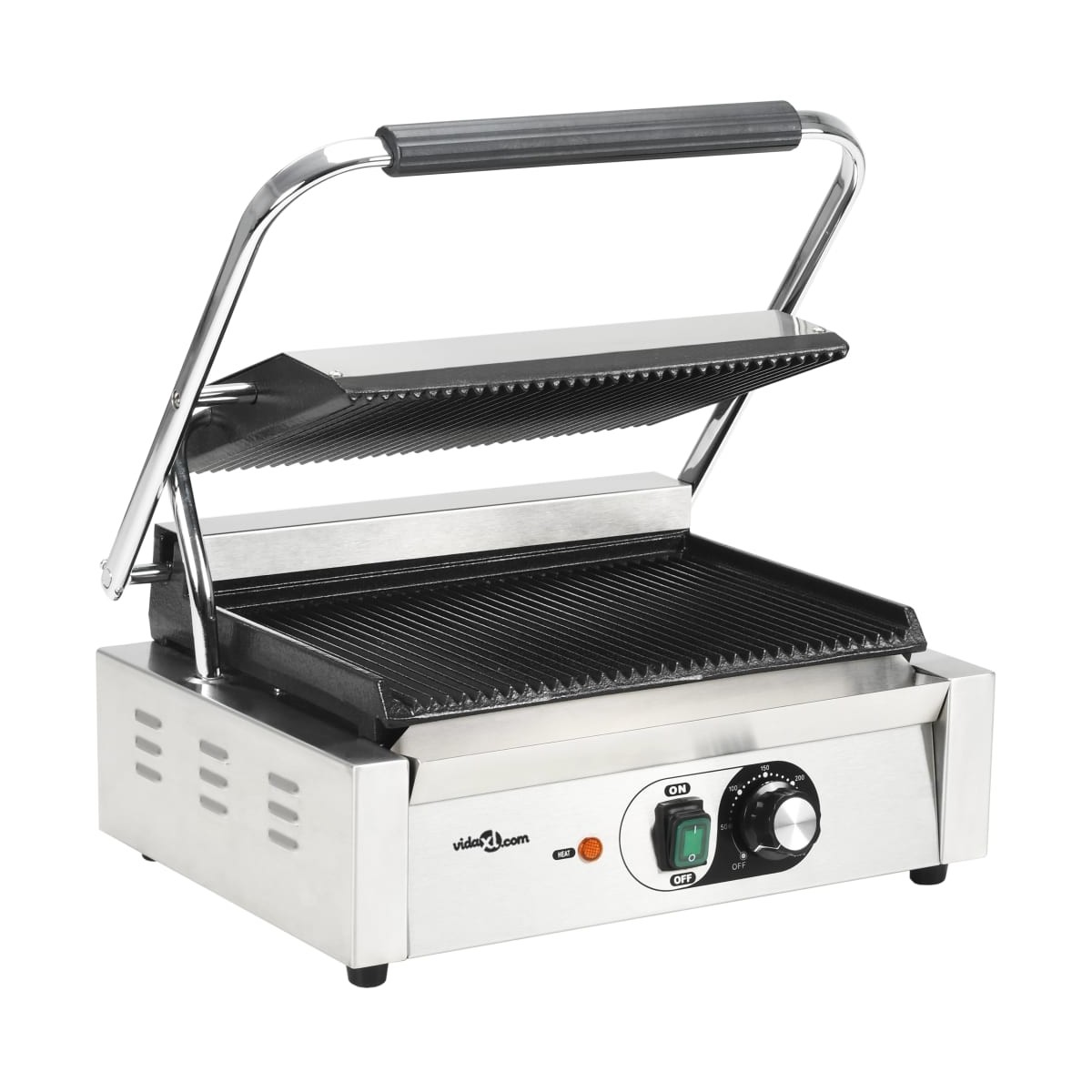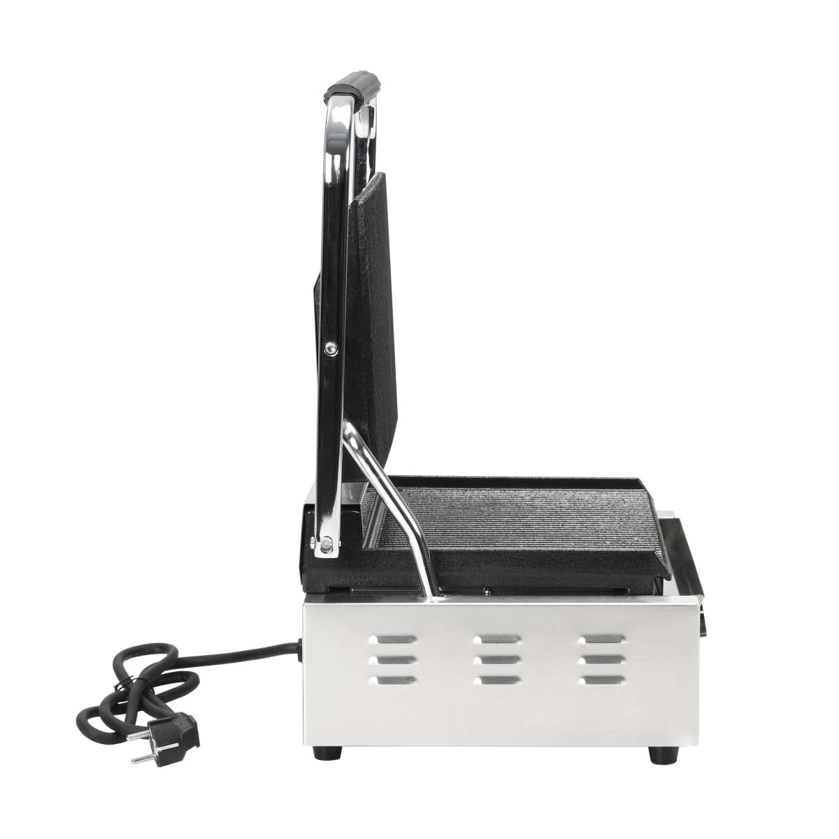 Nuestra parrilla grill acanalada es la opción perfecta para asar rápidamente paninis, sándwiches, hamburguesas, pollo, verduras, etc. Este grill de contacto tiene un cuerpo de acero inoxidable muy resistente que le da un aspecto excelente y lo hace duradero y fácil de limpiar. Cuenta con placas ranuradas de hierro fundido para la distribución de calor uniforme y asado rápido. La parrilla está equipada con un controlador de temperatura para los ajustes de calefacción variable de bajo, medio y alto. La plancha tiene una bandeja goteo para recoger el exceso de aceite que se puede quitar fácilmente para su limpieza. Un cepillo de limpieza también se incluye en la entrega.