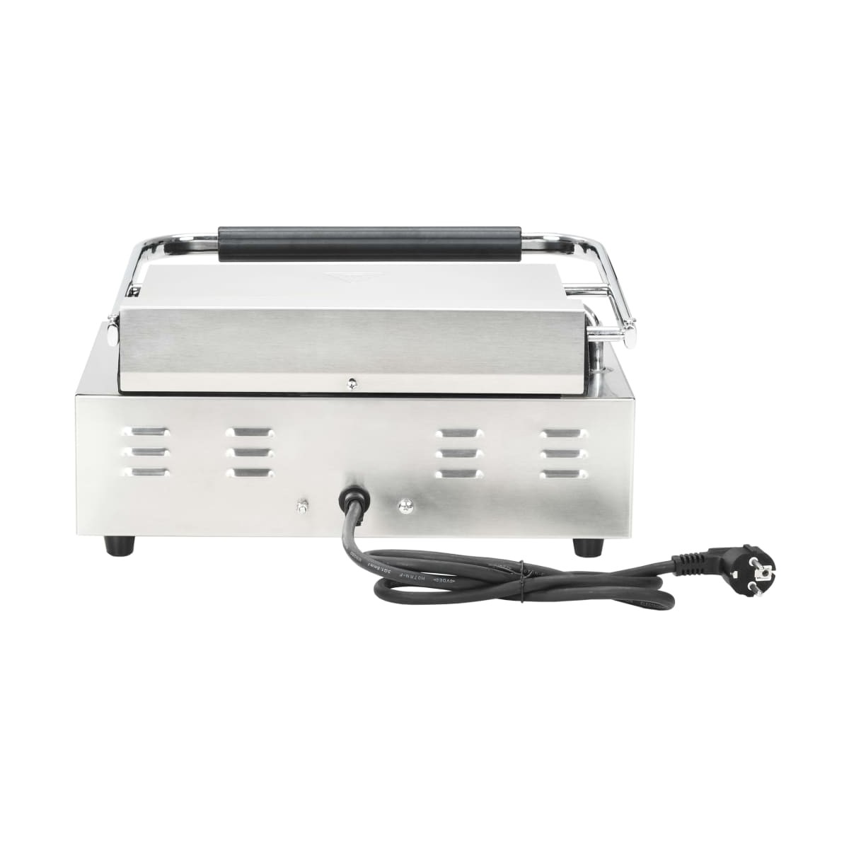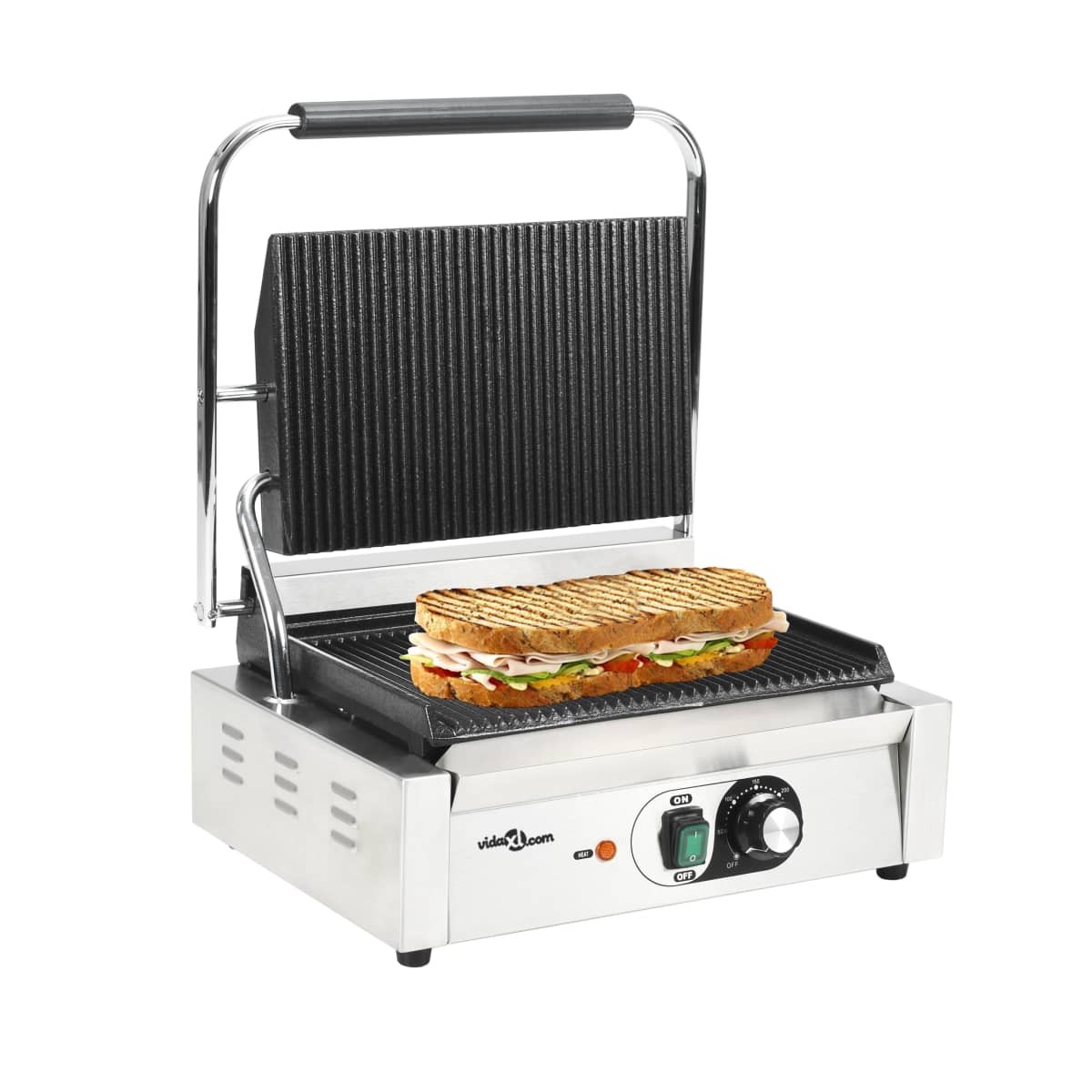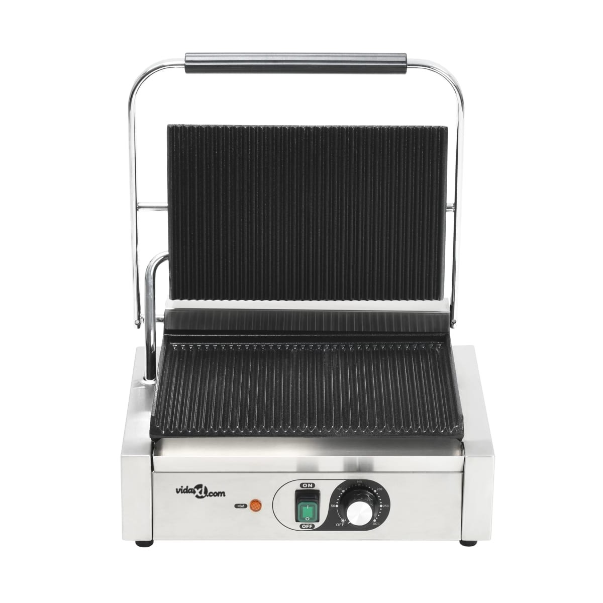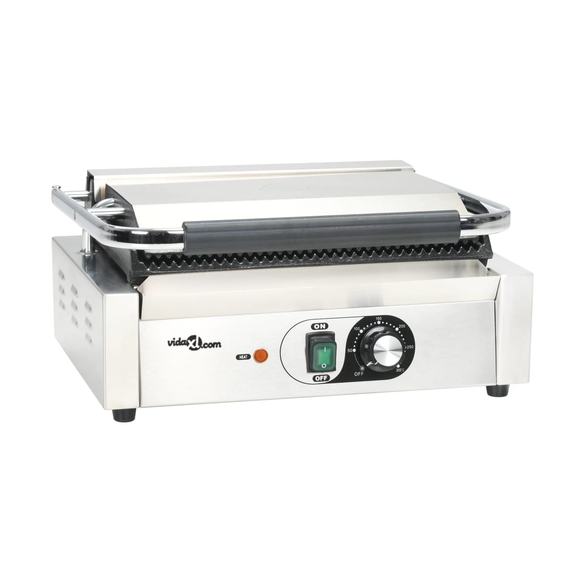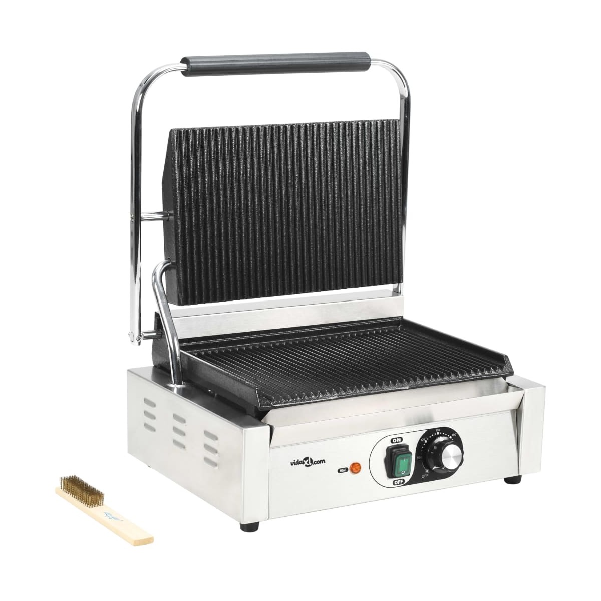 Nuestra parrilla grill acanalada es la opción perfecta para asar rápidamente paninis, sándwiches, hamburguesas, pollo, verduras, etc. Este grill de contacto tiene un cuerpo de acero inoxidable muy resistente que le da un aspecto excelente y lo hace duradero y fácil de limpiar. Cuenta con placas ranuradas de hierro fundido para la distribución de calor uniforme y asado rápido. La parrilla está equipada con un controlador de temperatura para los ajustes de calefacción variable de bajo, medio y alto. La plancha tiene una bandeja goteo para recoger el exceso de aceite que se puede quitar fácilmente para su limpieza. Un cepillo de limpieza también se incluye en la entrega.